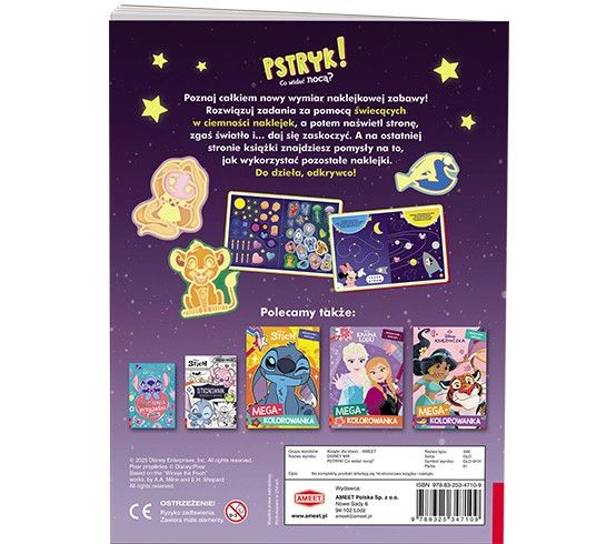 Dostępne: 4 Sztuk Lub zamów telefoniczne: 690 216 578Świat uwielbianych przez dzieci bohaterów Disneya staje się jeszcze bardziej niesamowity! Wszystko dzięki świecącym w ciemności naklejkom, które służą do rozwiązywania zadań. Po naświetleniu strony i zgaszeniu światła dziecko odkrywa nowe, fascynujące, świecące obrazki. W książce znajdują się też pomysły na zabawy z wykorzystaniem tych niezwykłych naklejek. To kto zrobi PSTRYK?