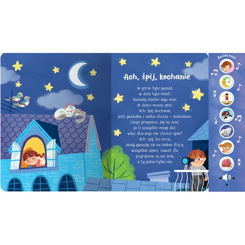 Słuchaj i śpiewaj razem z nami! W książce znajduje się siedem lubianych, odpowiednich dla dzieci kołysanek przekazywanych z pokolenia na pokolenie. Kolorowe ilustracje oraz teksty każdej z piosenek zachęcą dziecko do wspólnego śpiewania. Teksty otoczone są kolorowymi ilustracjami, nawiązującymi do treści piosenek, często je uzupełniają, a co najważniejsze – zachęcają do wspólnej zabawy. Piosenkę można włączyć, naciskając kółeczko z obrazkiem po prawej stronie książki. Jedno kółeczko odpowiada jednej piosence. W każdej chwili można wyłączyć grającą melodię, ponownie naciskając kółeczko. Książka działa na baterie, które można wyjąć i wymienić. Istnieje również możliwość wyłączenia grających piosenek, przesuwając guzik przy baterii. Książka sprawdzi się dla dzieci w każdym wieku. Młodsze mogą tylko słuchać piosenek, starsze dzieci mogą przeczytać tekst i śpiewać równocześnie z nagraniem.