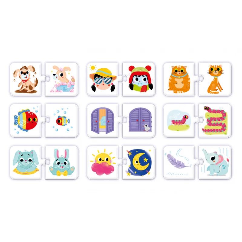 Puzzle służą do ułożenia 9 par puzzli przedstawiających przeciwieństwa, np.: ciepły - zimny, czysty - brudny, duży - mały. Dziecko wzbogaca swoje słownictwo, określając to, co znajduje się na obrazku, a także uczy się logicznego myślenia - odpowiednio dobierając puzzle w pary. W książeczce znajdują się obrazki do pokolorowania – dziecko utrwala poprawną wymowę elementów umieszczonych na obrazkach oraz ćwiczy rękę, kolorując. Dla dzieci powyżej 3. roku życia.