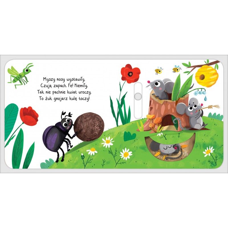 Dostępne: 3 Sztuk Lub zamów telefoniczne: 690 216 578Jakie zwierzę ukryło się w kopcu? Kto śpi w norce pod gniazdem? Co znajduje się w mrowisku? Wystarczy przyłożyć paluszek do kółeczka na ruchomych elementach i poruszać nimi – wówczas odkrywają się schowane części ilustracji i znajdujemy odpowiedzi na pytania. Dzieci uwielbiają zabawę książkami z ruchomymi elementami – to nie tylko miło spędzony czas, ale i bardzo pożytecznie: dziecko ćwiczy motorykę małą oraz rozwija wyobraźnię. W książce znajdują się ilustracje: żaby, żuka, pszczół i myszek, biedronek i ślimaków, motyli i mrówek, bociana i kreta. Zabawne wierszyki dopasowane do ilustracji są dodatkową atrakcją tej ciekawej książeczki. Poruszaj ruchomymi obrazkami, słuchaj zabawnych wierszyków i baw się z bohaterami tej książeczki. Seria "Co odkryję paluszkiem" to doskonała sensoryczna zabawa dla najmłodszych.