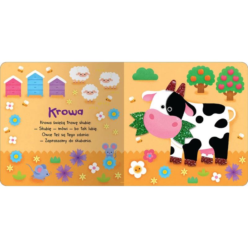 Dostępne: 3 Sztuk Lub zamów telefoniczne: 690 216 578Pogłaszcz zwierzęta. Na wsi. Książeczka sensoryczna z brokatem