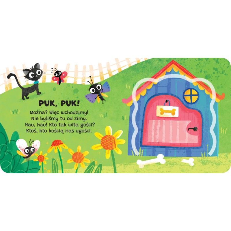 Aktywizująca książeczka dla najmłodszych. Zabawa tą książką polega na otwieraniu okienek, w których kryją się zwierzęta: piesek, owce, królik, kurczątko, krowa. Na każdej rozkładówce znajduje się zabawny wierszyk, który podpowiada, jakiego zwierzątka szukamy – wierszowany tekst łatwo zapada w pamięć i po kilku dniach zabawy dziecko będzie znało wierszyki, dzięki czemu ćwiczy pamięć i wzbogaca swoje słownictwo. Książeczka z okienkami to doskonała zabawa dla każdego dziecka.