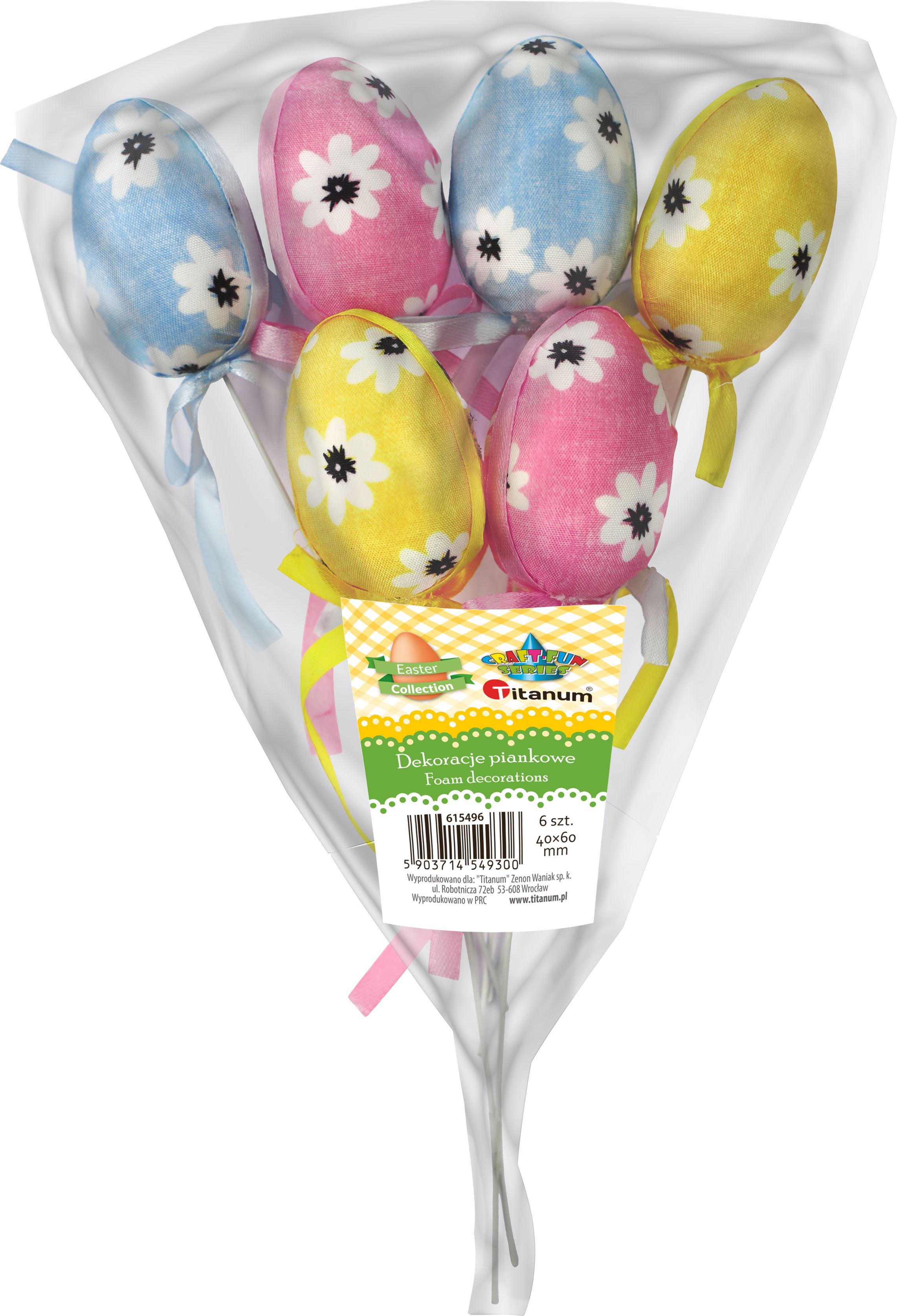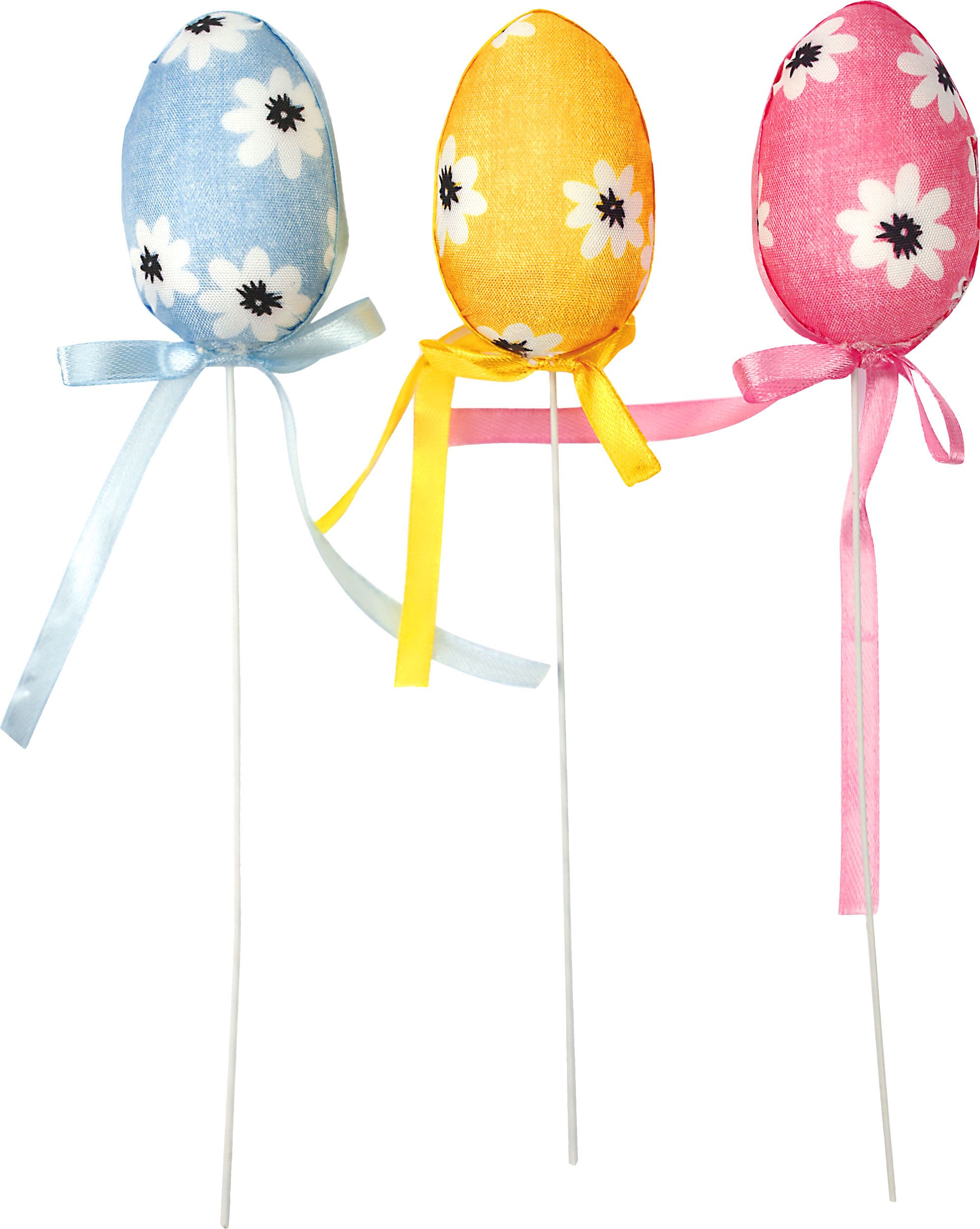 Dostępne: 626 Sztuk Lub zamów telefoniczne: 690 216 578Jajka styropianowe 40 x 60 mm, z dekoracją materiałową w kwiaty i wstążką, na piku ok. 19 cm, 3 kolory: różowy, żółty, niebieski. 6 sztuk.