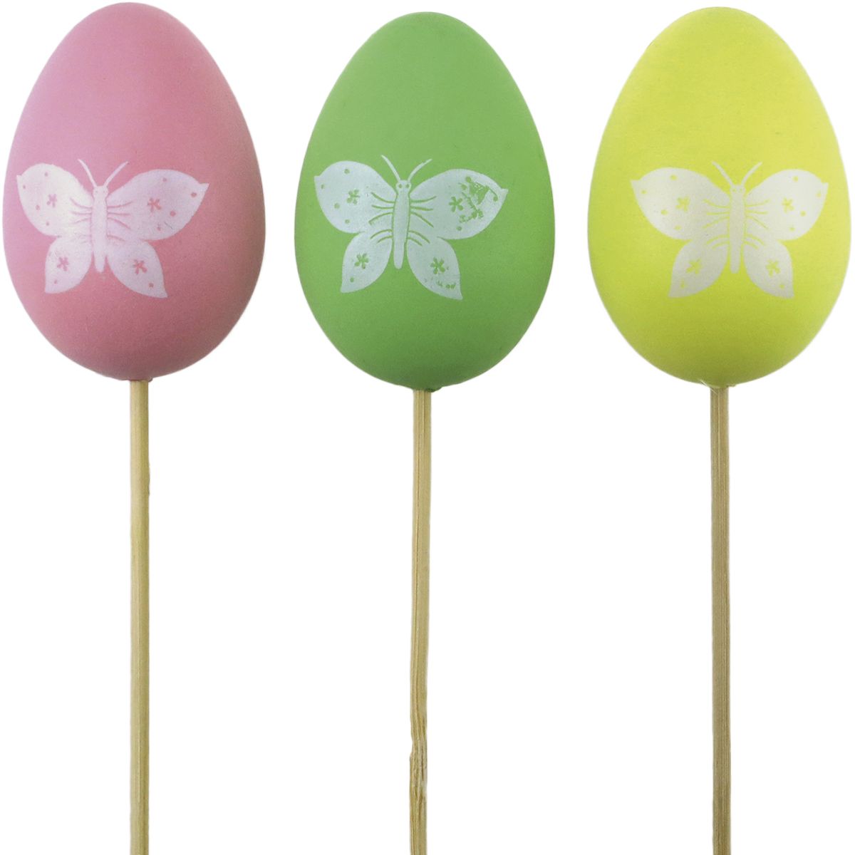 Dostępne: 246 Sztuk Lub zamów telefoniczne: 690 216 578Jajka plastikowe, wymiary: 40 x 60 mm, na piku o długości ok. 30 cm, kolor: jasnożółte, jasnozielone, jasnoróżowe, z białym nadrukiem motyla. 6 sztuk.