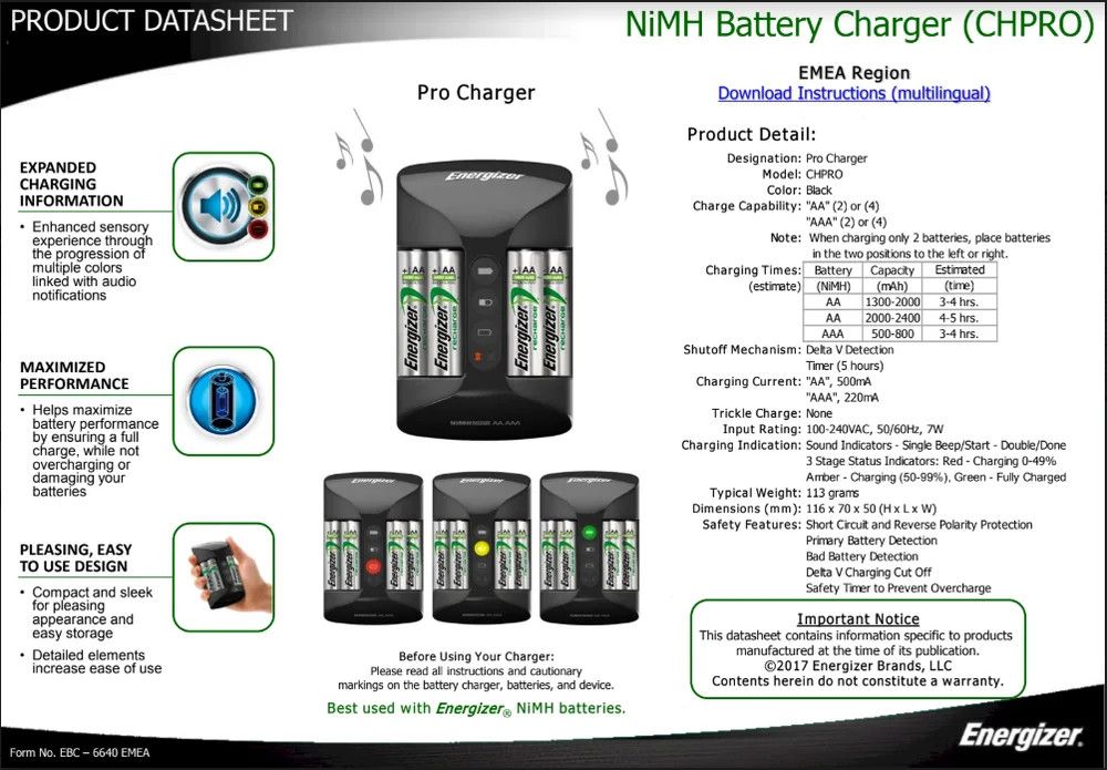 Ładuje dwa lub cztery akumulatory AA lub AAA w czasie od 3 do 6 godzin. Jest zasilana z gniazda sieciowego i posiada wbudowaną ochronę przed przeładowaniem. Maksymalizuje liczbę cykli ładowania chroniąc ładowarkę przed uszkodzeniem.