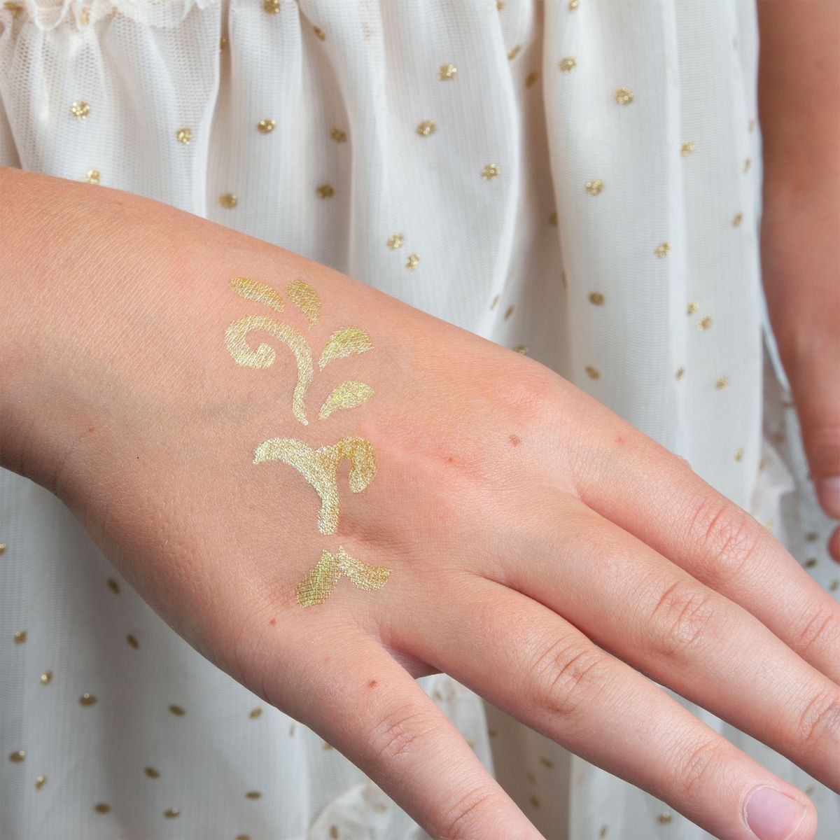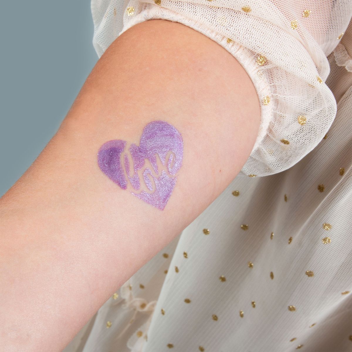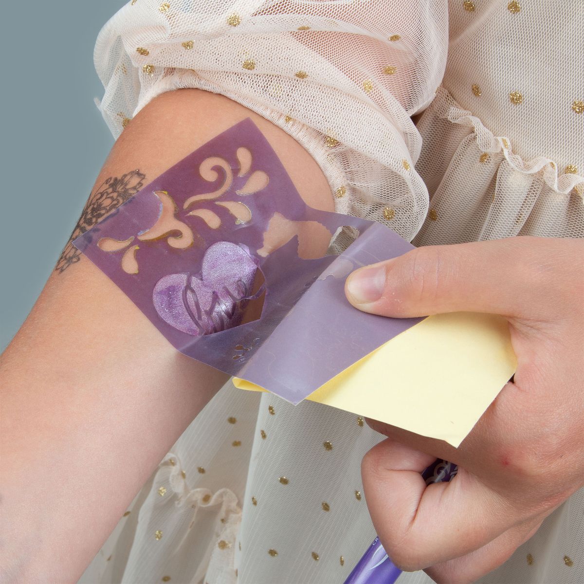 Dostępne: 6 Sztuk Lub zamów telefoniczne: 690 216 578Markery do tatuażu z szablonami od Kidea. W opakowaniu znajdują się trzy brokatowe markery: fioletowy, turkusowy i złoty oraz dwa arkusze z szablonami. Znajdziemy wśród nich ananasa, loda na patyku, babeczkę, czterolistną koniczynkę, konika morskiego, gekona, serce oraz motywy roślinne. Aby nanieść tatuaż na skórę wystarczy przyłożyć wybrany szablon i pomalować skórę markerem lub dać ponieść się wyobraźni i stworzyć własny, unikatowy wzór. Kolorowe, nietuzinkowe tatuaże zrobią wrażenie na rówieśnikach i dopełnią każdą stylizację. Markery są całkowicie zmywalne, a tusz można usunąć płynem micelarnym.