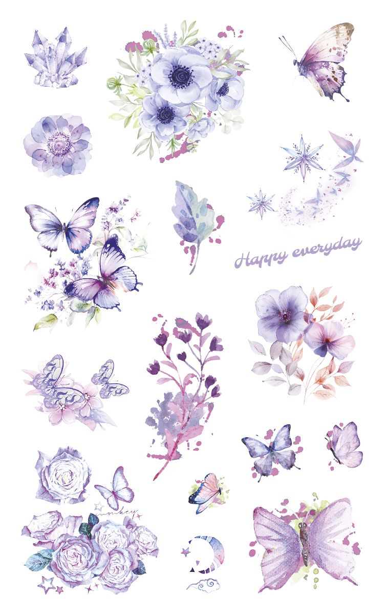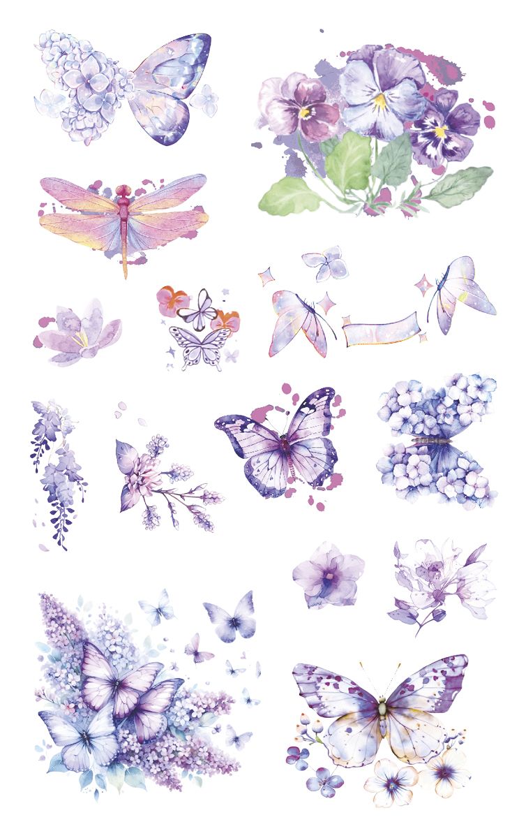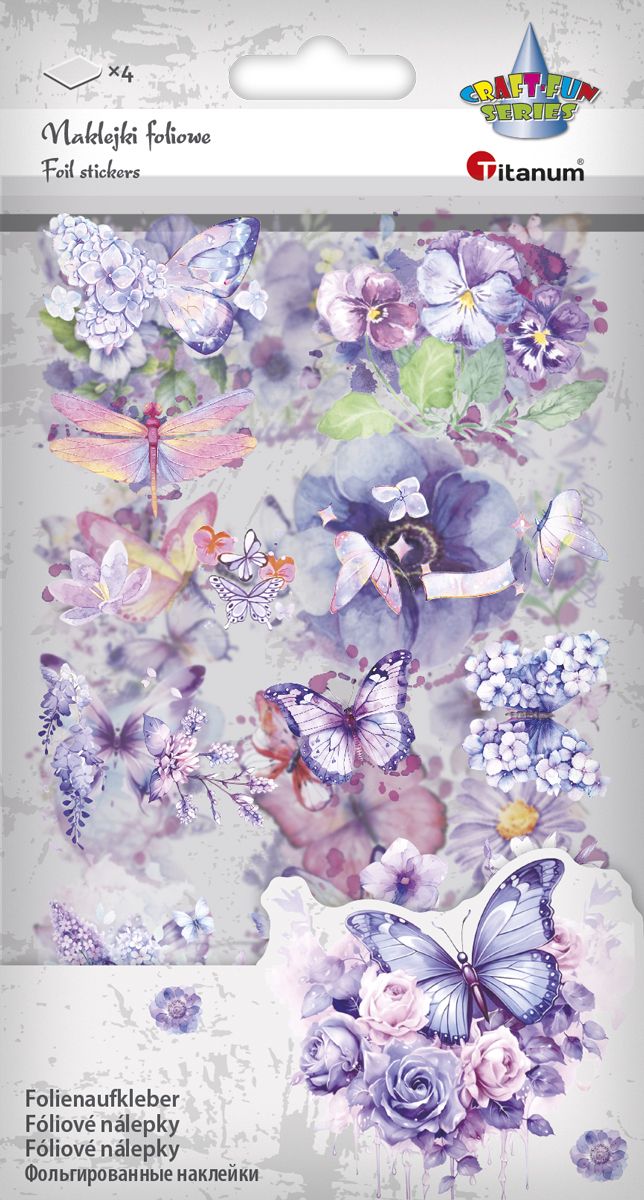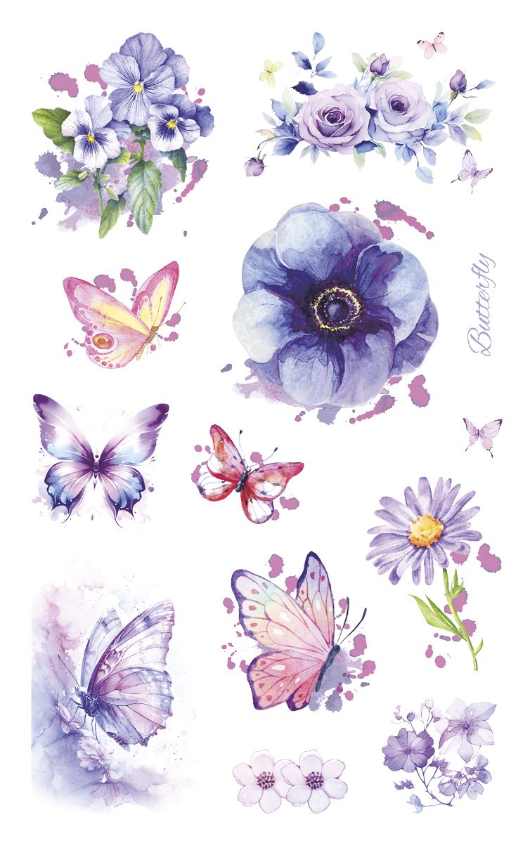 Dostępne: 1184 Sztuk Lub zamów telefoniczne: 690 216 578Naklejki foliowe, 4 plansze, wzory: motyle, kwiaty. tonacja fioletowa.