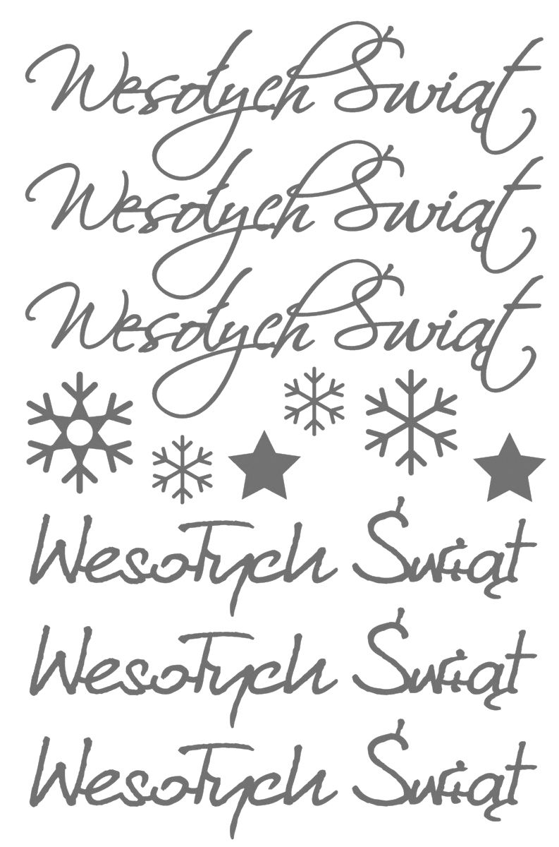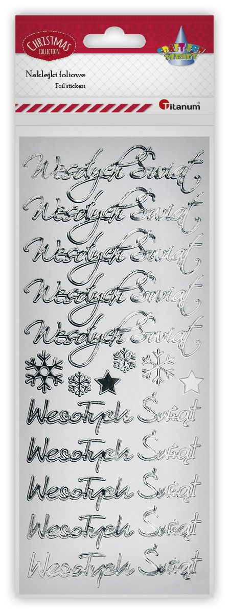 Naklejki foliowe, wzory: napisy "Wesołych Świąt" (dostępne w dwóch wariantach), gwiazdki (2 sztuki) i srebrne płatki śniegu (4 sztuki).