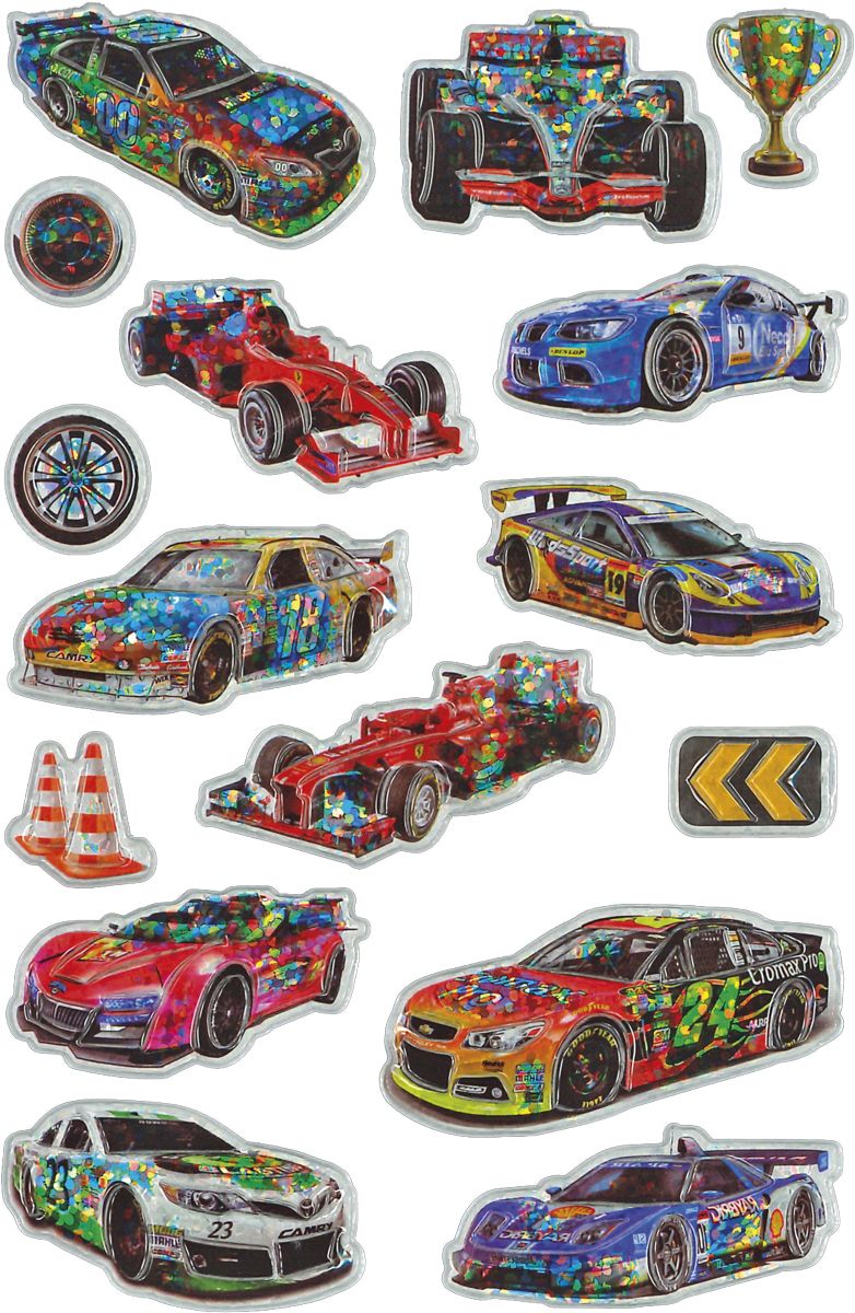 Dostępne: 1772 Sztuk Lub zamów telefoniczne: 690 216 578Naklejki wypukłe, wzór: samochody wyścigowe, hologram. 16 sztuk.