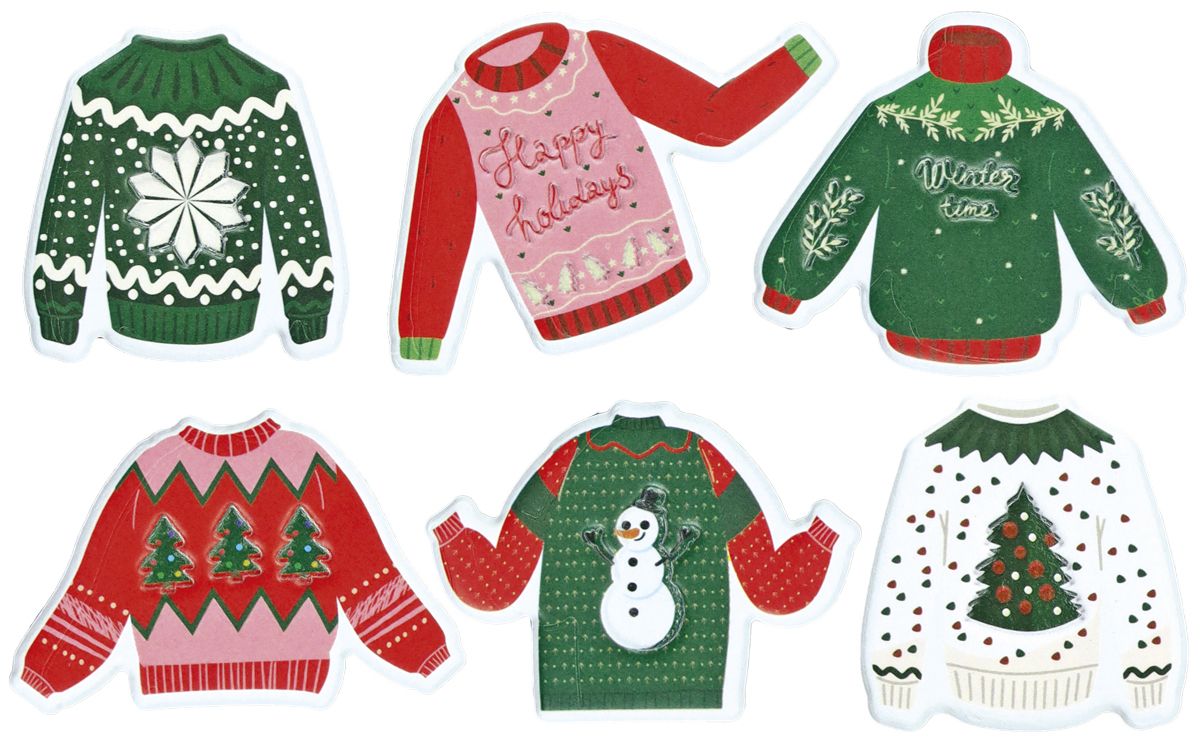 Dostępne: 1534 Sztuk Lub zamów telefoniczne: 690 216 578Naklejki wypukłe, wzór: świąteczne sweterki. 12 sztuk.