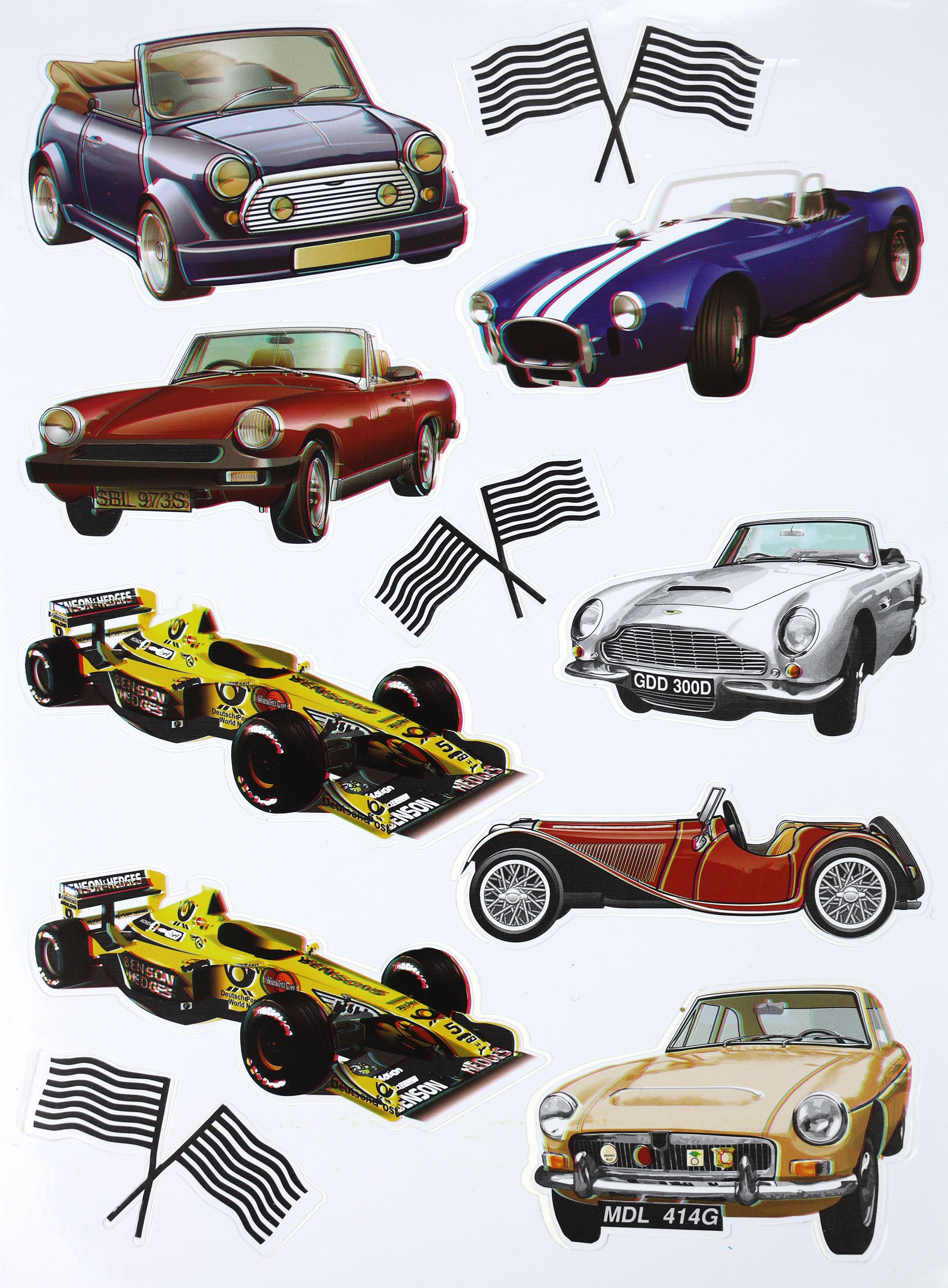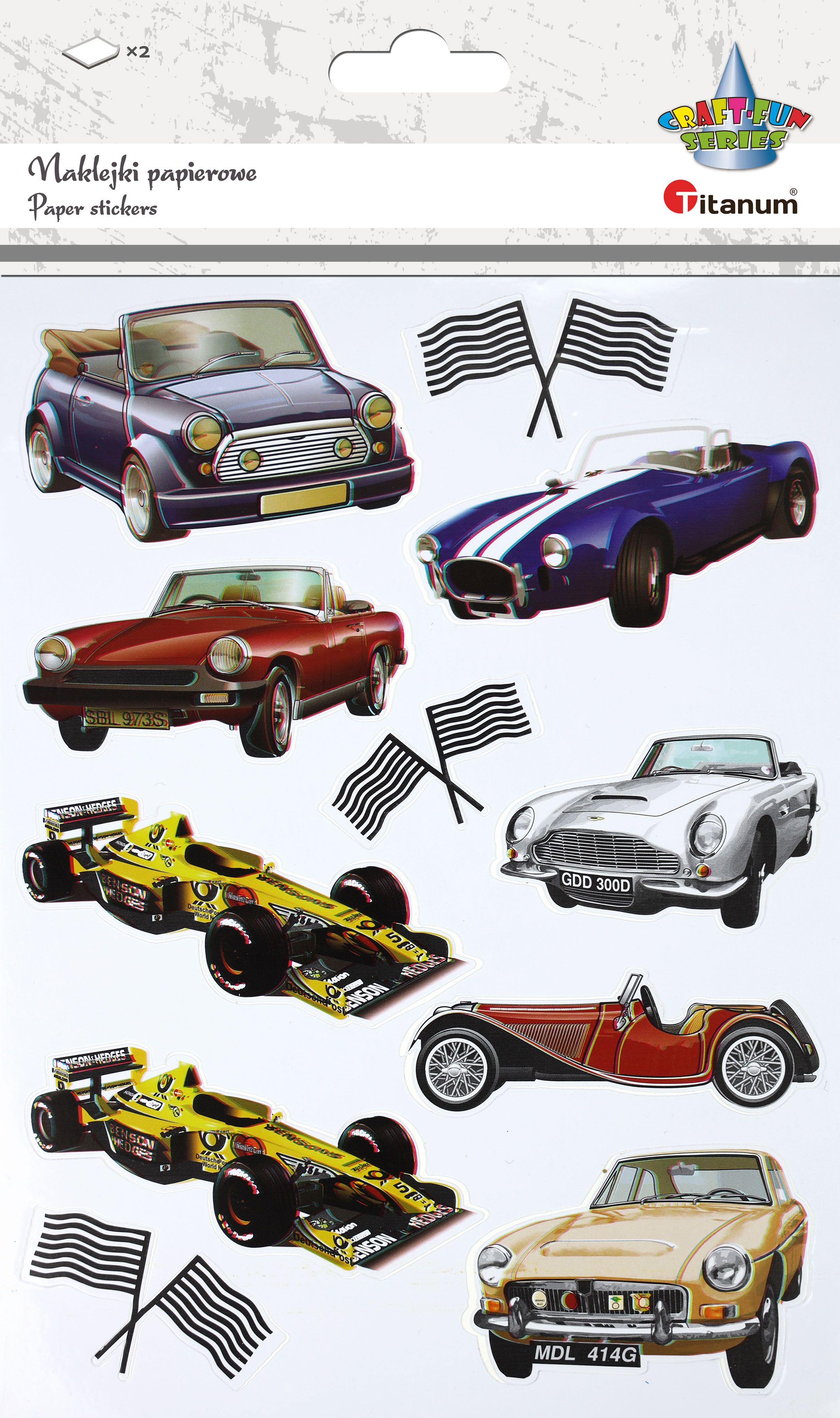 Dostępne: 1767 Sztuk Lub zamów telefoniczne: 690 216 578Naklejki papierowe, 2 plansze, wzór: samochody, flagi. 22 sztuki.