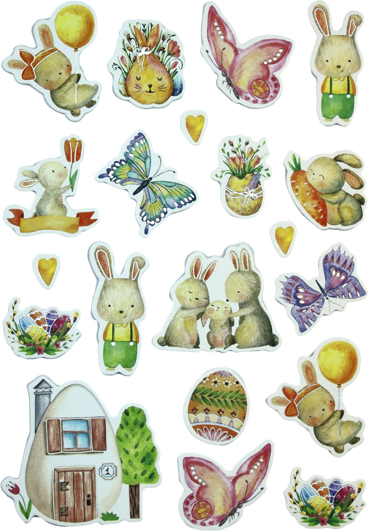 Dostępne: 4 Sztuk Lub zamów telefoniczne: 690 216 578Naklejki wypukłe, wzory: zajączki, motyle, domek z pisanki. 20 sztuk.