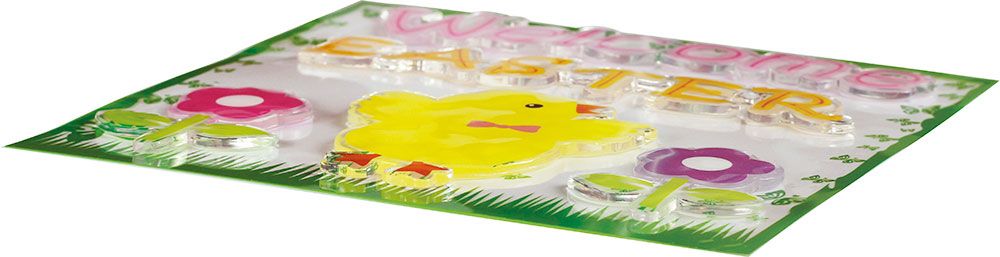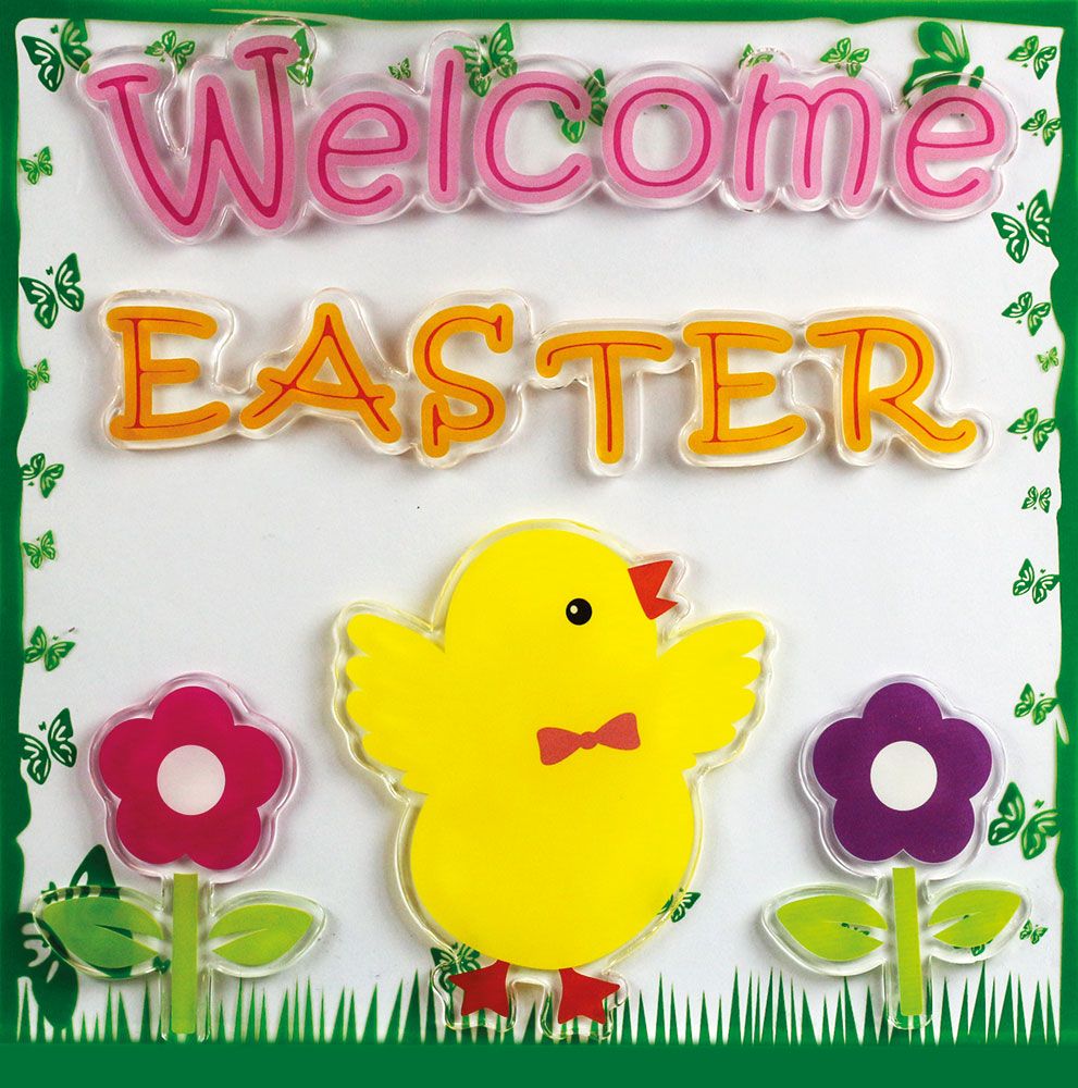 Dostępne: 1201 Sztuk Lub zamów telefoniczne: 690 216 578Naklejki żelowe, wzory: napis Welcome Easter, kurczaczek, kwiaty. 5 sztuk.