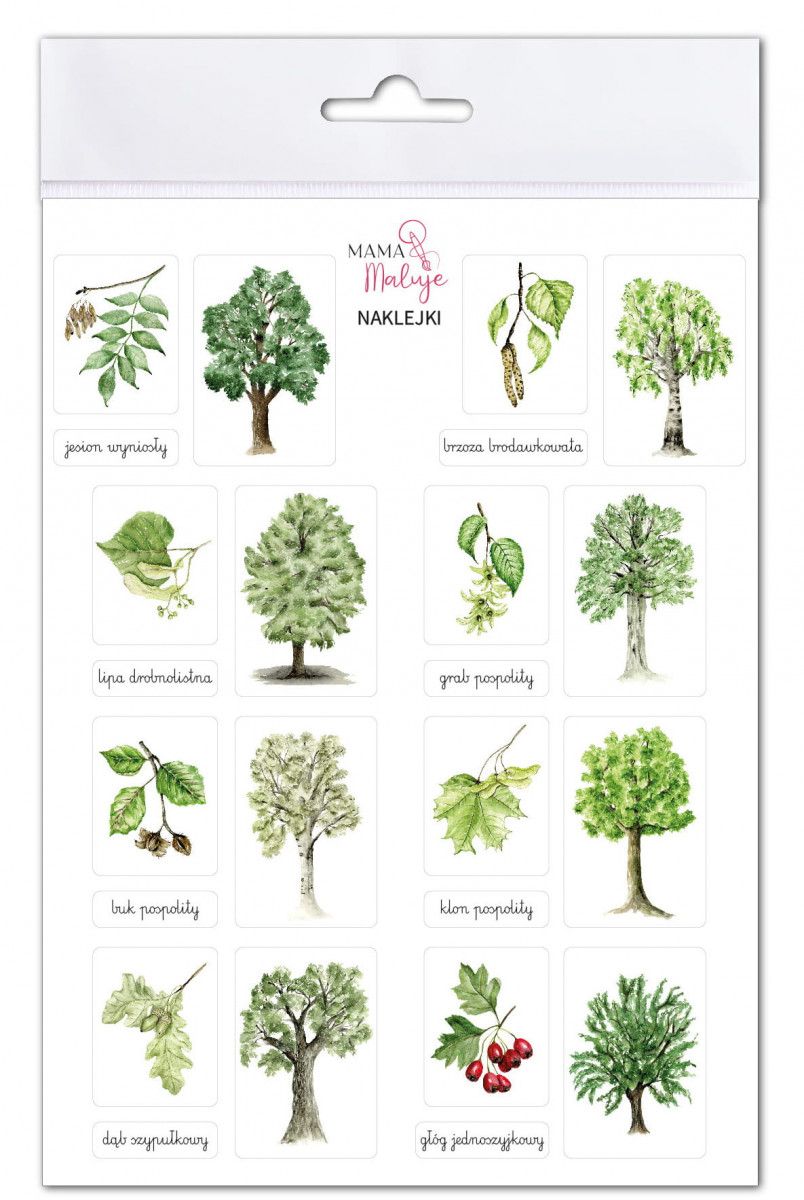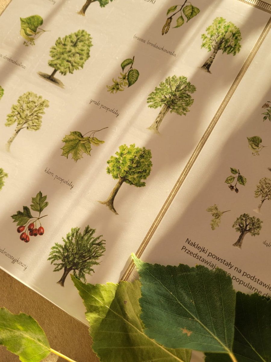 Wszystkie gatunki zawierają podpisy, dzięki czemu nikt nie będzie miał problemów w ich rozróżnianiu. Na odwrocie arkusza znajduje się wykaz przedstawionych na naklejkach drzew i ich owoców.