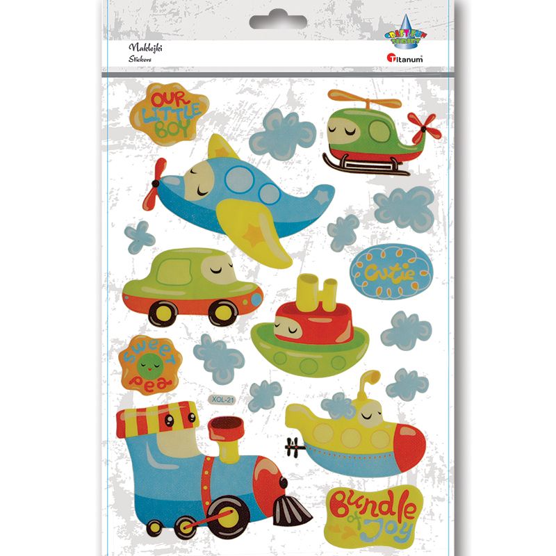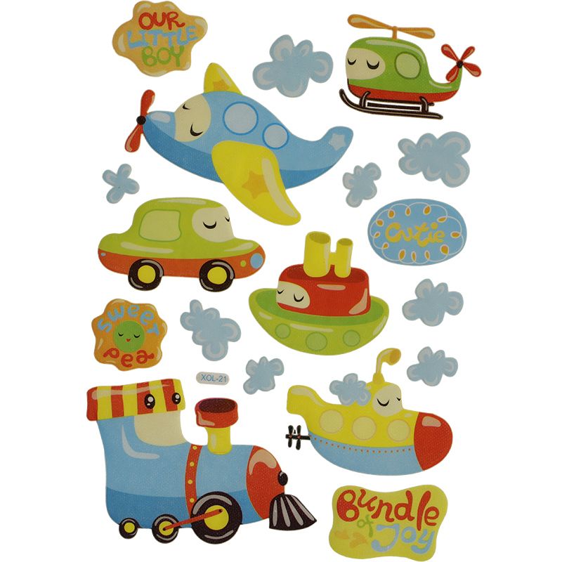 Naklejki wypukłe miękkie. Wzór: Our little Boy, Bundle of Joy, samolot, helikopter, samochód, łódka, łódź podwodna, lokomotywa, chmurki. 18 sztuk.