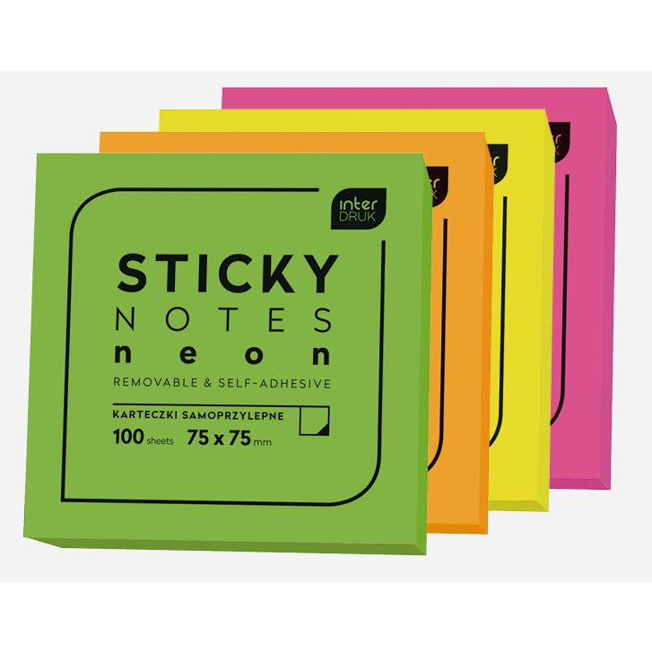 Dostępne: 16 Sztuk Lub zamów telefoniczne: 690 216 578Uniwersalne karteczki samoprzylepne wielokrotnego użytku w 4 neonowych kolorach. Nie pozostawiają śladu po odklejeniu. Format: 75x75 mm. 100 szt.