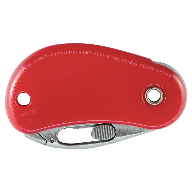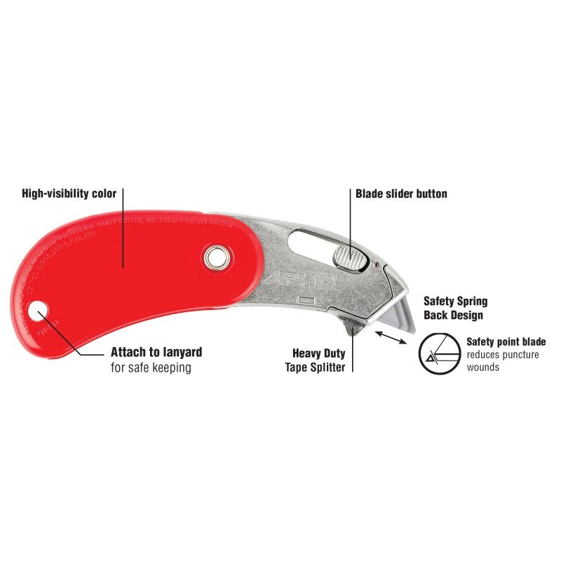Wyposażony w niewielkie samochowające się ostrze i kolec do prucia taśmy pakowej.