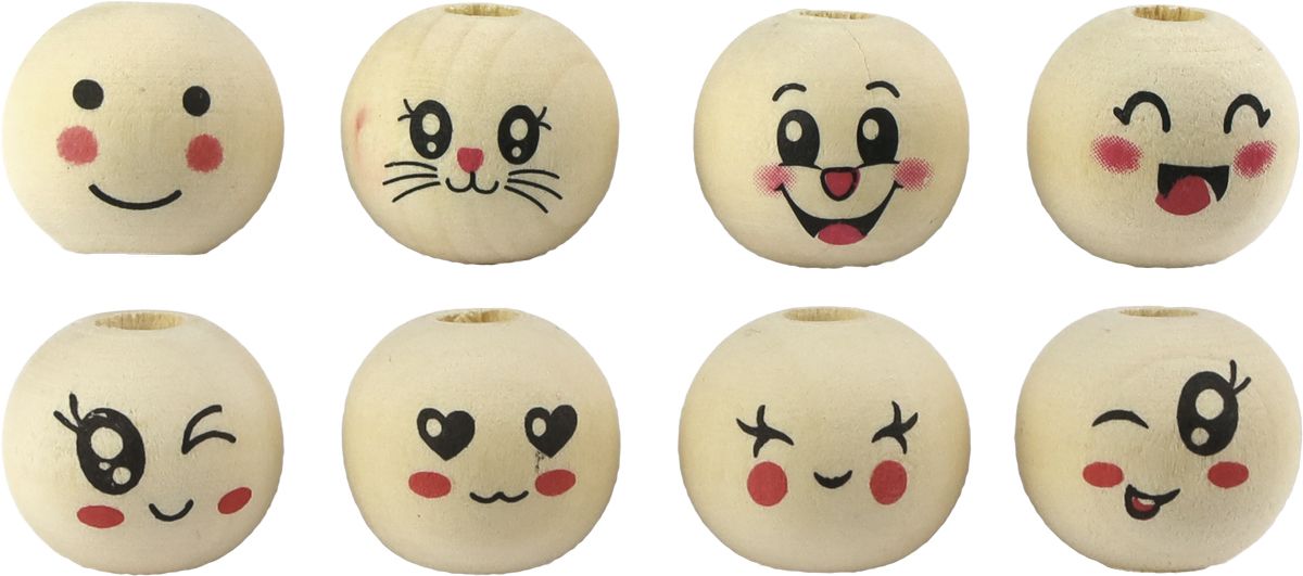Dostępne: 1624 Sztuk Lub zamów telefoniczne: 690 216 578Koraliki drewniane, okrągłe, emotki, średnica 20 mm, otwór o średnicy 5 mm, naturalne drewno. 8 sztuk.