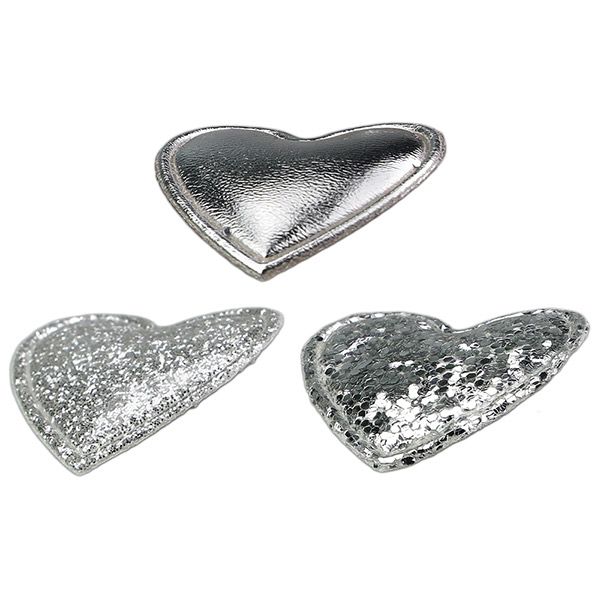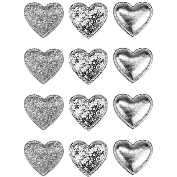 Dostępne: 596 Sztuk Lub zamów telefoniczne: 690 216 578Dekoracje samoprzylepne materiałowe, wzór: serca PU, wymiary: 32x30 mm, 3 wzory: drobny brokat, duży brokat, gładkie, kolor: srebrne. 12 sztuk.