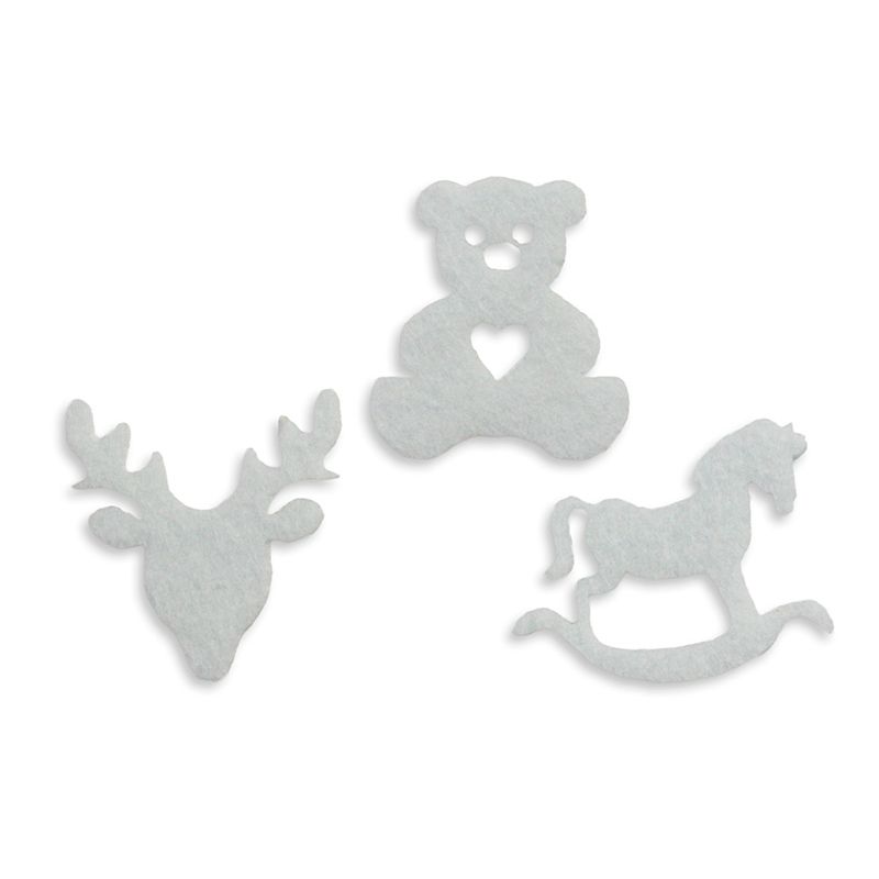 Dostępne: 926 Sztuk Lub zamów telefoniczne: 690 216 578Dekoracja z białego filcu. Kształty: głowa renifera, miś, koń na biegunach. Wymiary: głowa jelenia 35 x 36 mm, miś 32 x 35 mm, konik na biegunach 37 x 30 mm. Opakowanie 12 szt.