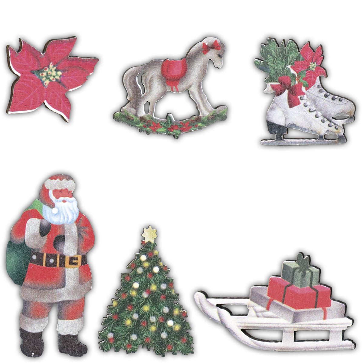 Dostępne: 793 Sztuk Lub zamów telefoniczne: 690 216 578Drewniane dekoracje w drewnianym pudełku, 6 wzorów Boże Narodzenie: sanki z prezentami, łyżwy, Mikołaj, koń na biegunach, choinka, poinsecja. 36 sztuk.