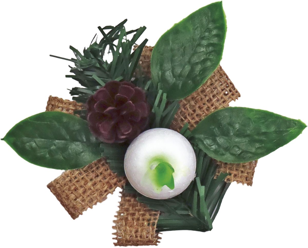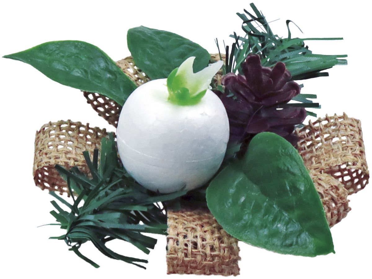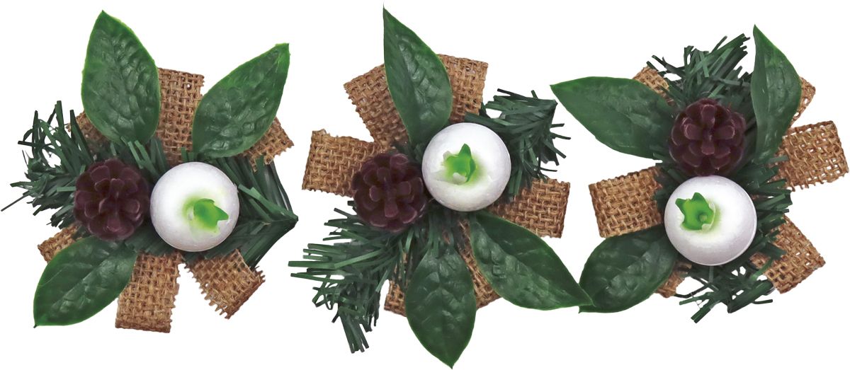 Dostępne: 1236 Sztuk Lub zamów telefoniczne: 690 216 578Stroiki świąteczne 10cm na jutowej wstążce z szyszką, listkami i białą styropianową bombką. 3 sztuki.