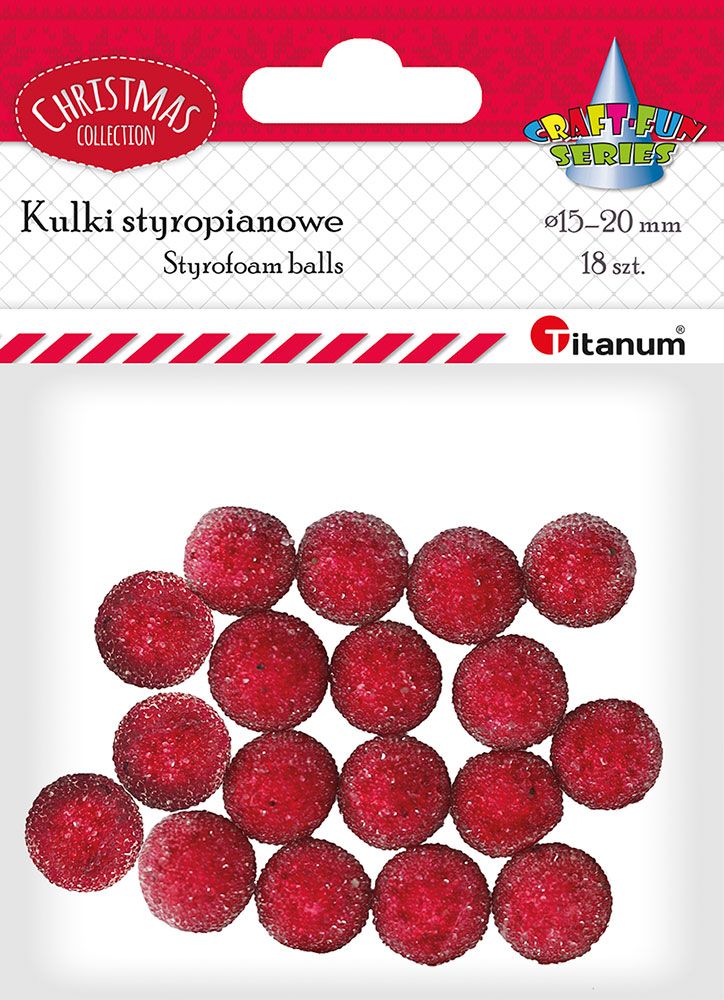 Dostępne: 860 Sztuk Lub zamów telefoniczne: 690 216 578Styropianowe kule, średnica 12 mm, 15mm, kryształkowe czerwone. 24 sztuki.
