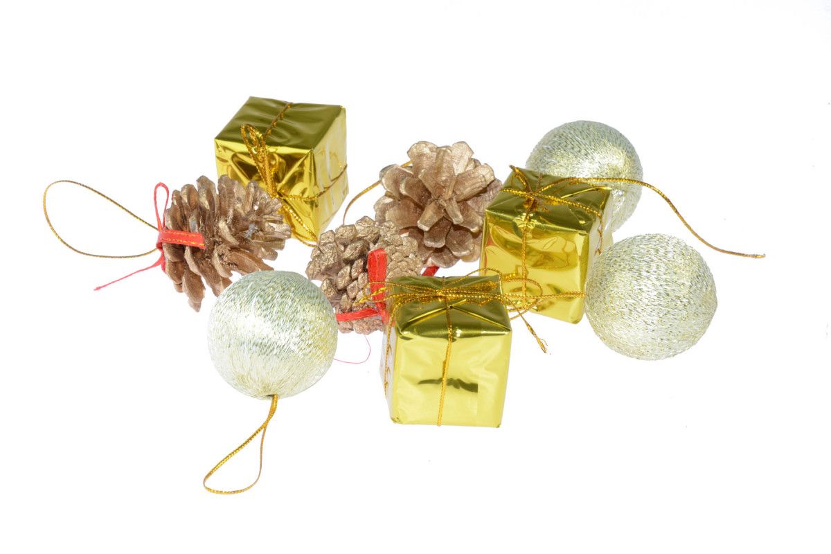Dostępne: 12 Sztuk Lub zamów telefoniczne: 690 216 578Mix świątecznych dekoracji w różnych kształtach. W zestawie zawieszki w kształcie kuli, złote mini prezenciki oraz szyszki naturalne z wstążką. Możliwość użycia do dekoracji choinki lub świątecznych stroików i kompozycji. Dekoracje w rozmiarach około 3,5 cm.