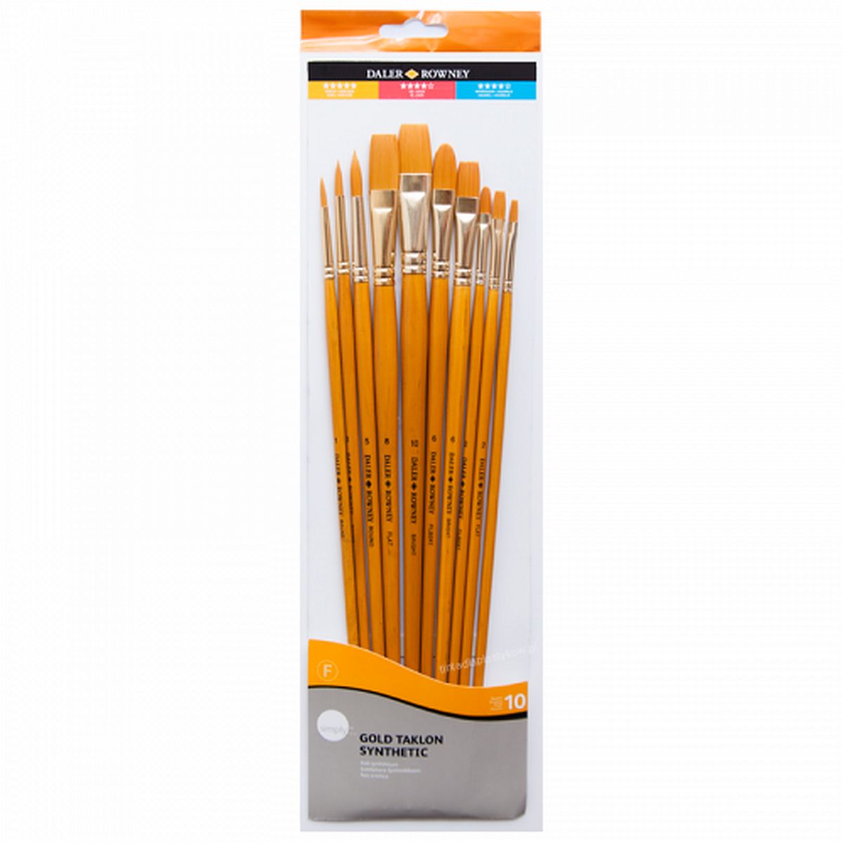 Zestaw 10 pędzli Daler-Rowney Simply do oleju, akwareli i akrylu z syntetycznego włosia zawiera: trzy pędzle okrągłe w rozmiarach 1,3,5 cztery pędzle płaskie w rozmiarach 2,6,8,10, dwa pędzle koci języczek rozmiary 2,6 oraz jeden pędzel płaski z krótkim włosiem w rozmiarze 2.