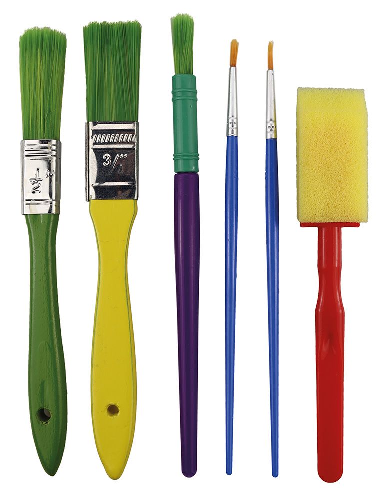 Dostępne: 1348 Sztuk Lub zamów telefoniczne: 690 216 578Komplet 6 pędzli składający się z: 5 pędzli z włosiem syntetycznym i 1 pędzla gąbkowego, kolorowe uchwyty wykonane z drewna oraz plastiku. W zestawie: 1 pędzel płaski w rozmiarze: 1/2"""", 1 pędzel płaski w rozmiarze: 3/4"""", 1 gruby pędzel okrągły, 2 cienkie pędzle okrągłe, 1 pędzel gąbkowy (szerokość gąbki: 25 mm.)