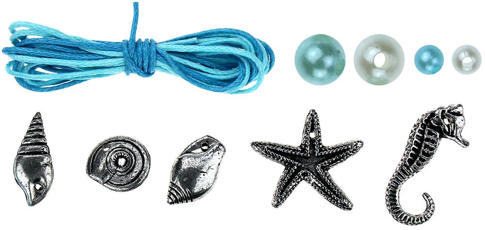 Dostępne: 451 Sztuk Lub zamów telefoniczne: 690 216 578Koraliki plastikowe, zestaw do zrobienia biżuterii, tonacja błękitna, elementy - perełki #x00F810/8/6 mm białe, błękitne, metalowe charmsy rozgwiazda 23x21 mm, konik morski 12x27 mm, muszelki 10x17/13x13 mm, sznurek dwukolorowy. 30 g.
