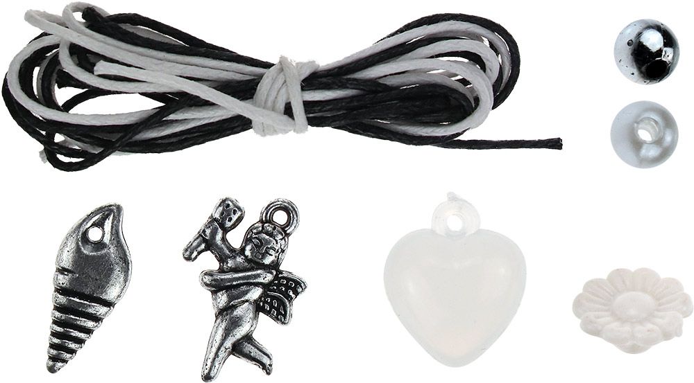 Dostępne: 330 Sztuk Lub zamów telefoniczne: 690 216 578Koraliki plastikowe, zestaw do zrobienia biżuterii, tonacja biała, elementy - perełki białe średnica 8 mm, koraliki srebrne średnica 8 mm, kwiaty białe 6x13 mm, charmsy plastikowe serca białe 15x18 mm, metalowa muszelka 9x20 mm, amorek 14x22 mm, sznurek dwukolorowy. 30 g.