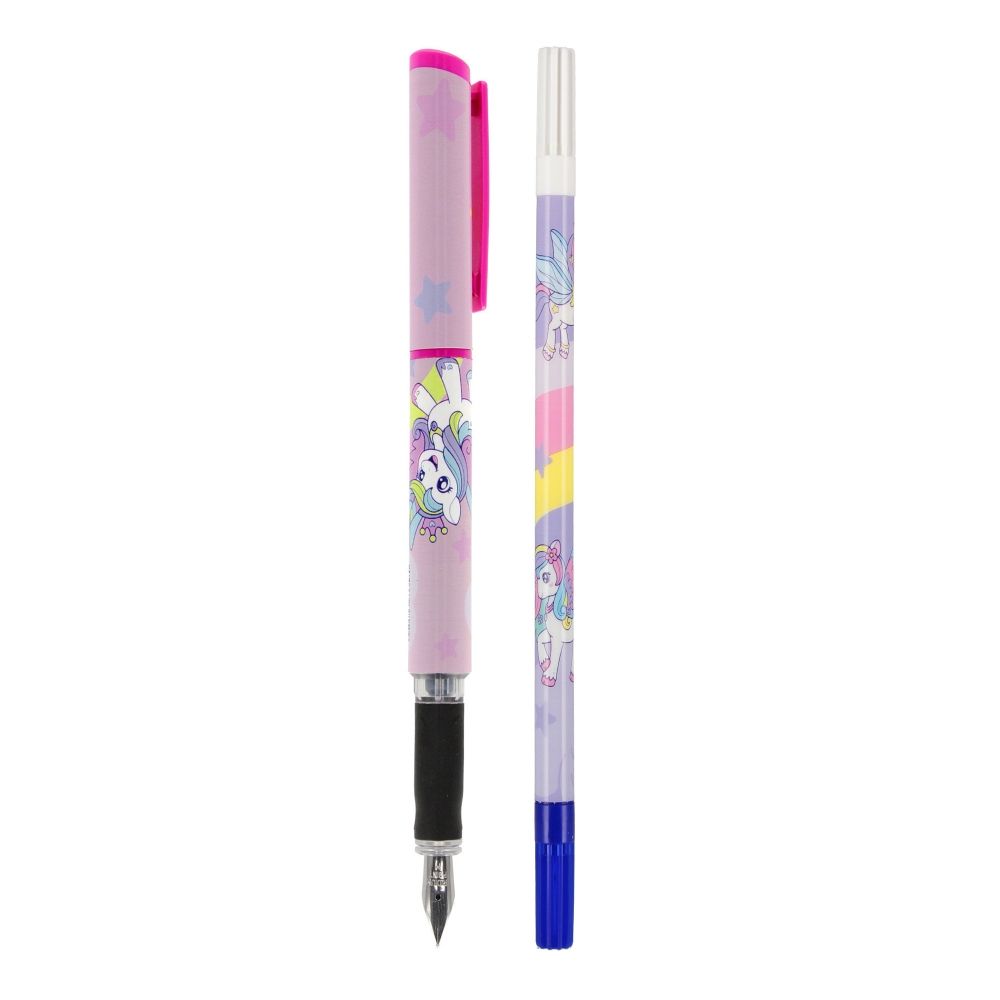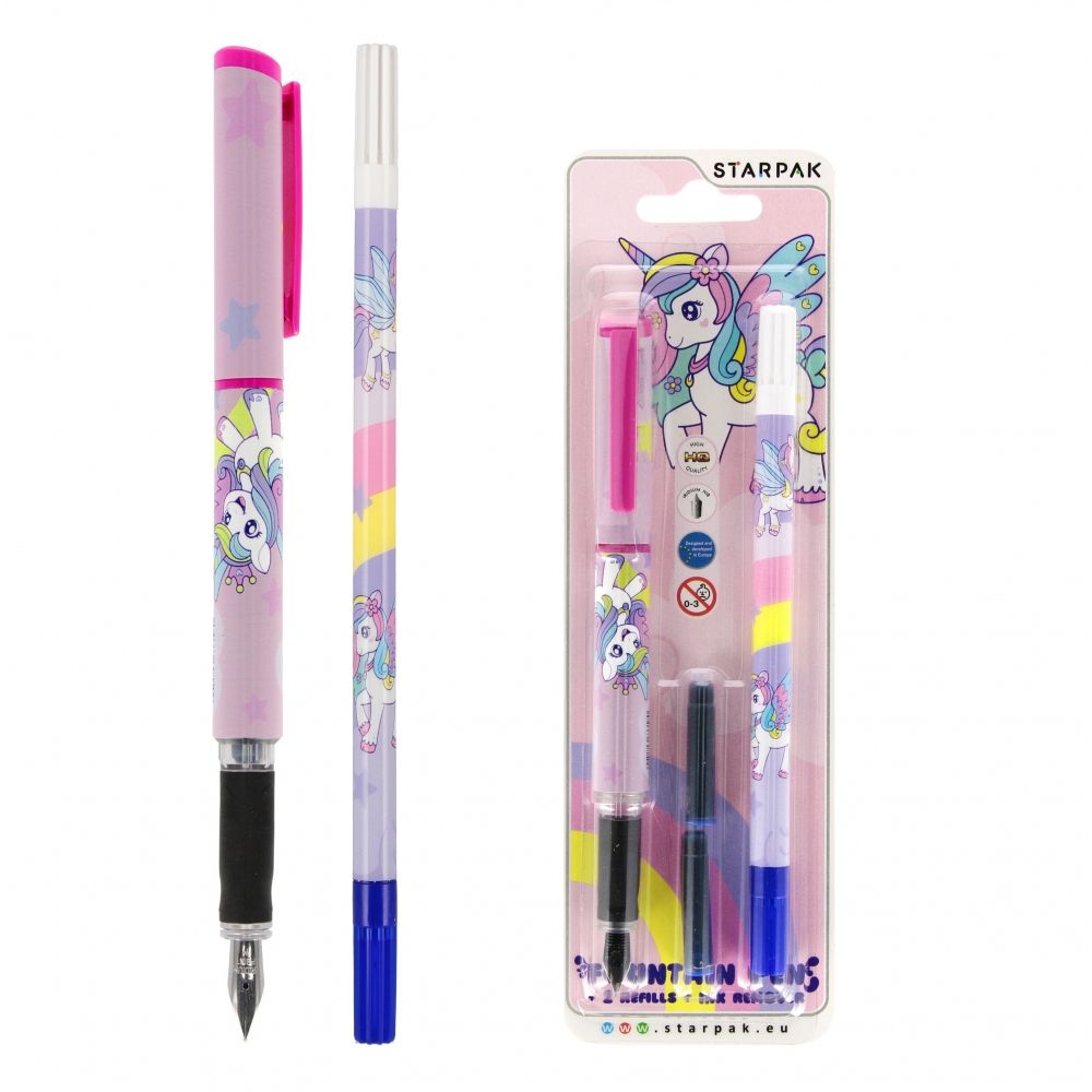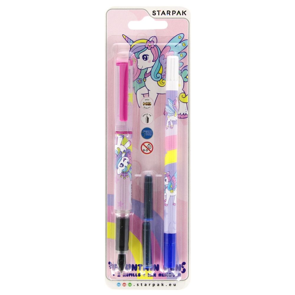 Zalety produktu: Pióro wieczne Unicorn STARPAK o kształcie dostosowanym do dłoni dziecka, z wytrzymałą stalówką, wykonaną z wysokiej jakości materiału. Specjalnie wyprofilowana, antypoślizgowa strefa uchwytu zapewnia komfort i pomaga w nauce pisania Twojego dziecka. Zapoznaj się również z innymi produktami dedykowanymi biurze i szkole W piórze znajduje się miejsce na zapasowy wkład, dzięki czemu Twojemu dziecku nigdy nie zabraknie atramentu w trakcie pisania. Całość została ozdobiona dziecięcą grafiką z ulubionym Jednorożcem. W zestawie dwa naboje wymienne i dwustronny wymazywacz w pisaku. Końcówka wymazująca oznaczona białą zakrętką skutecznie usuwa błędy, a końcówka korygująca oznaczona niebieską zakrętką pozwala na poprawę błędów. Wymazywacz również został ozdobiony nadrukiem Jednorożca, dzięki czemu tworzy komplet z piórem wiecznym. Wykonane z trwałego materiału. Zestaw pakowany na blistrze. Produkt nieodpowiedni dla dzieci poniżej 3 lat. Wymiary produktu pióro 13 cm, wymazywacz 17 cm. Wymiary opakowania wys. x szer. x gł. cm : 23x7x2 Waga opakowania kg. 0,03kg. Pakowanie karton 40szt.