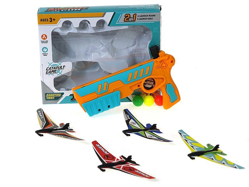 Dostępne: 2 Sztuk Lub zamów telefoniczne: 690 216 578pistolet na piłeczki, z wyrzutnią samolotów; 26x22x18cm, W/B
