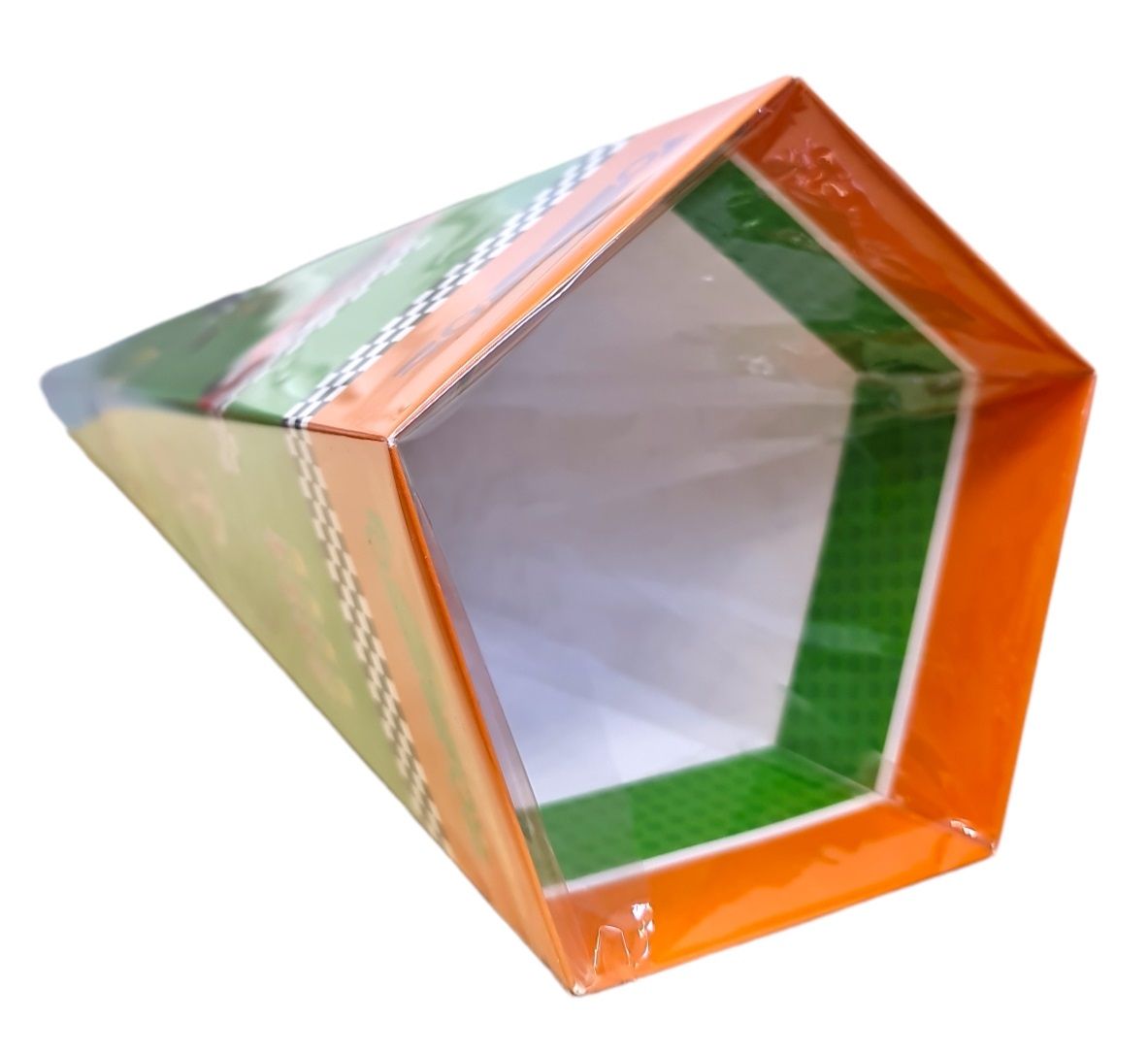 Forma odwróconego ostrosłupa o podstawie pięciokąta prawidłowego z celofanem z możliwością zawiązania wstążką.