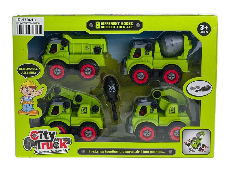 Zestaw zawiera 4 pojazdy budowlane do skręcania oraz narzędzia (klucz francuski, śrubokręt, młotek). Rozmiary: 33x23,5x7,5 cm. Waga: poniżej 1 kg.