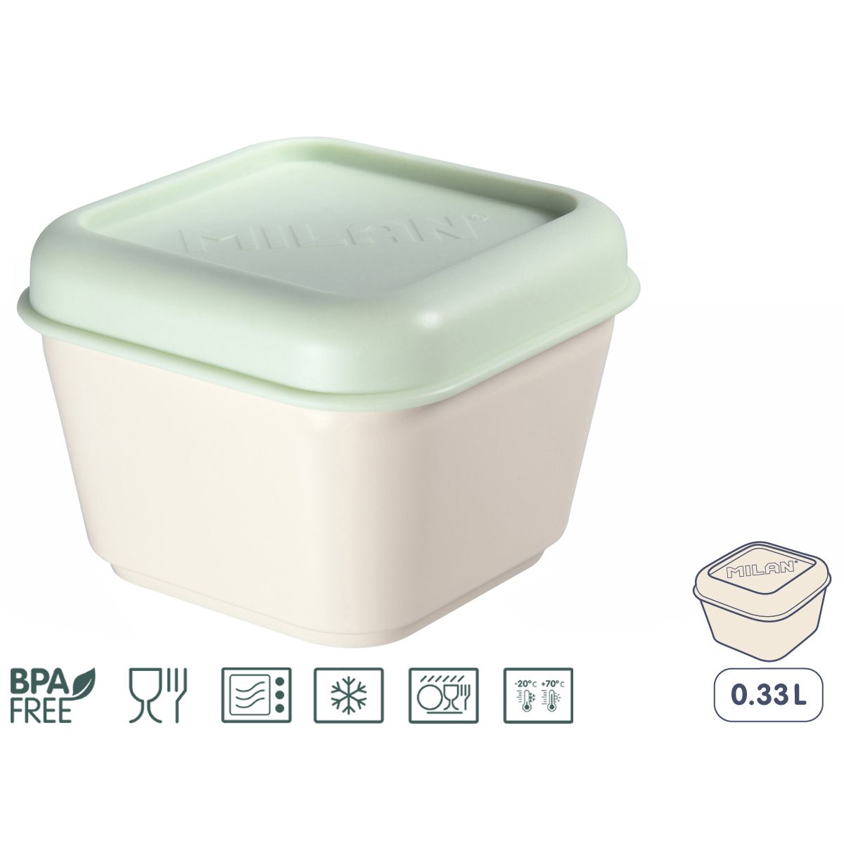 Kwadratowy biały pojemnik na lunch z zieloną pokrywką MILAN. Nadaje się do podgrzewania w kuchence mikrofalowej (maks. 70?C) z otwartą pokrywą w celu uwolnienia pary. Nadaje się także do przechowywania w zamrażarce (do -20?C) oraz do mycia w zmywarce do naczyń (maks. 70?C). Pokrywy i pojemnik można łatwo łączyć ze sobą. Matowe zewnętrzne wykończenie ułatwia uchwyt. Wnętrze z zaokrąglonymi narożnikami i błyszczącym wykończeniem dla lepszego czyszczenia. Materiał: tworzywo sztuczne wolne od BPA. Rozmiar: 10 x 10 x 7,4 cm. Pojemność: 0,33 litra.