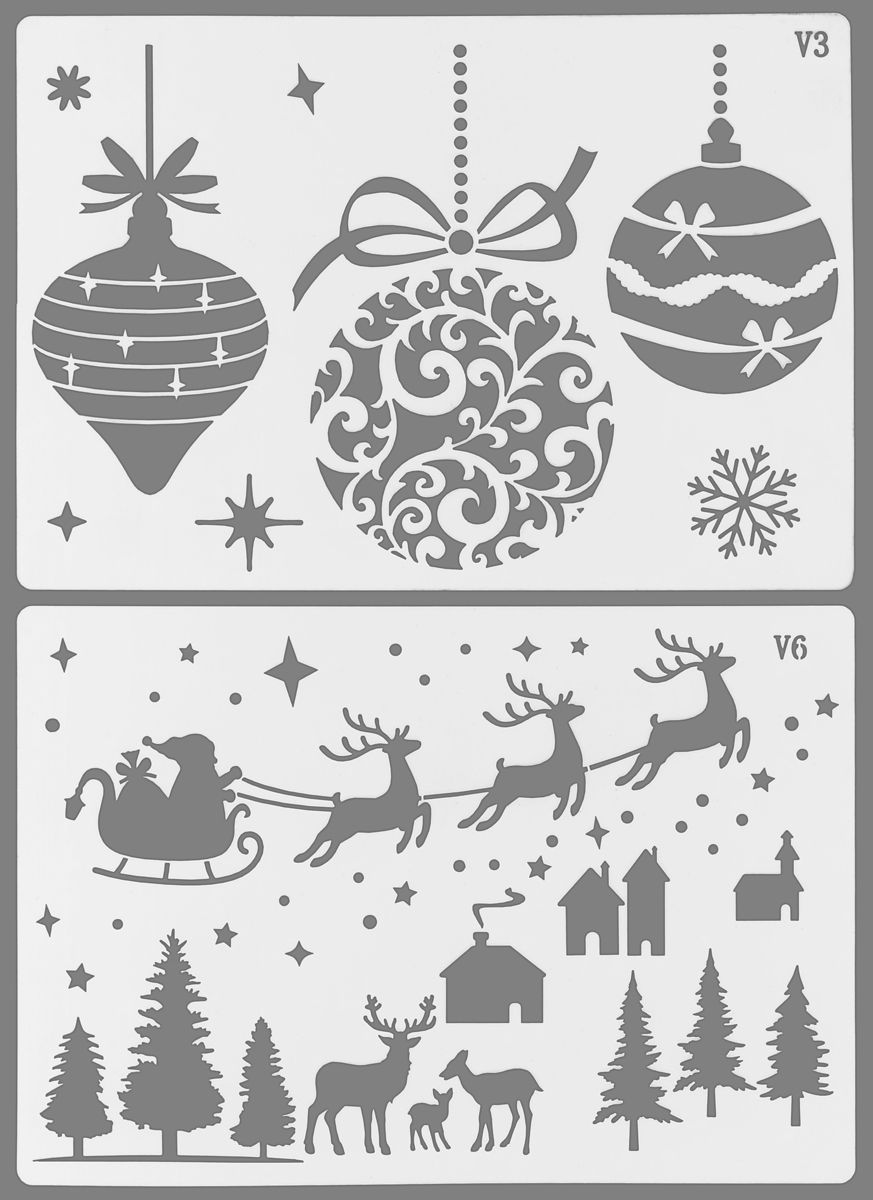 Dostępne: 155 Sztuk Lub zamów telefoniczne: 690 216 578Szablony plastikowe, miękkie, wymiary: 260 x 178 mm, wzory: bombki / sanie Mikołaja, choinki, renifery, domki. 2 sztuki.