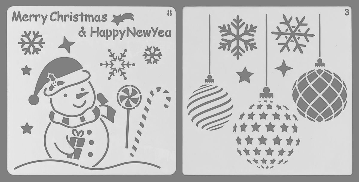 Dostępne: 56 Sztuk Lub zamów telefoniczne: 690 216 578Szablony plastikowe, miękkie, wymiary: 130 x 130 mm, wzory: bombki, płatki śniegu / napis 'Merry Christmas & Happy New Year', bałwanek. 2 sztuki.
