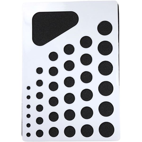 Szablon do quillingu, plastikowy, na piankowej macie, z okrągłymi otworami o różnych średnicach. Ułatwia zwijanie pasków i ich utrzymanie w utworzonym wzorze podczas schnięcia sklejonych elementów.
