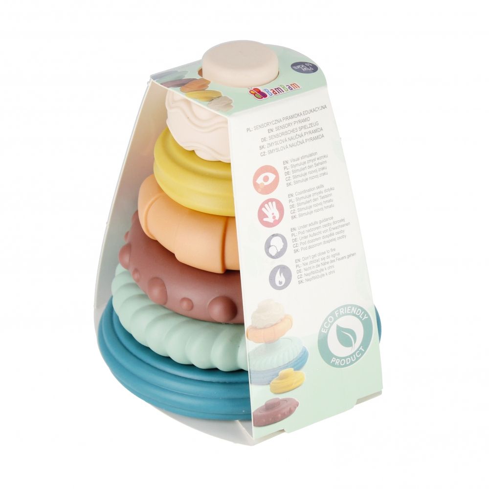 Okręgi EDUKACYJNEJ PIRAMIDKI PASTELOWEJ doskonale sprawdzają się w pierwszym okresie nauki sortowania i ćwiczenia zdolności motorycznych. Układanie kaskadowe okręgów, a następnie potrząsanie nimi dostarcza dziecku wielu radości i aktywizuje go do działania. Zróżnicowana faktura i nieregularna powierzchnia oraz kształt okręgów dodatkowo wzbogaca doznania dotykowe wpływając na intensyfikacje zmysłu dotyku. Pastelowe kolory stymulują zmysł wzroku i percepcji, zabawka doskonale rozwija wyobraźnię i zdolności poznawcze. Wymiary/waga/baterie: wymiary produktu (dł. x wys. x gł.) [cm]: 10x12x10, wymiary opakowania (dł. x wys. x gł.)[cm]: 10x13x11, waga produktu bez opakowania [kg]: 0,22 kg, waga produktu w opakowaniu [kg]: 0,23 kg, nie wymaga zasilania bateriami. Piramidka przeznaczona dla dzieci w wieku: 6m+. Pakowana w banderoli.