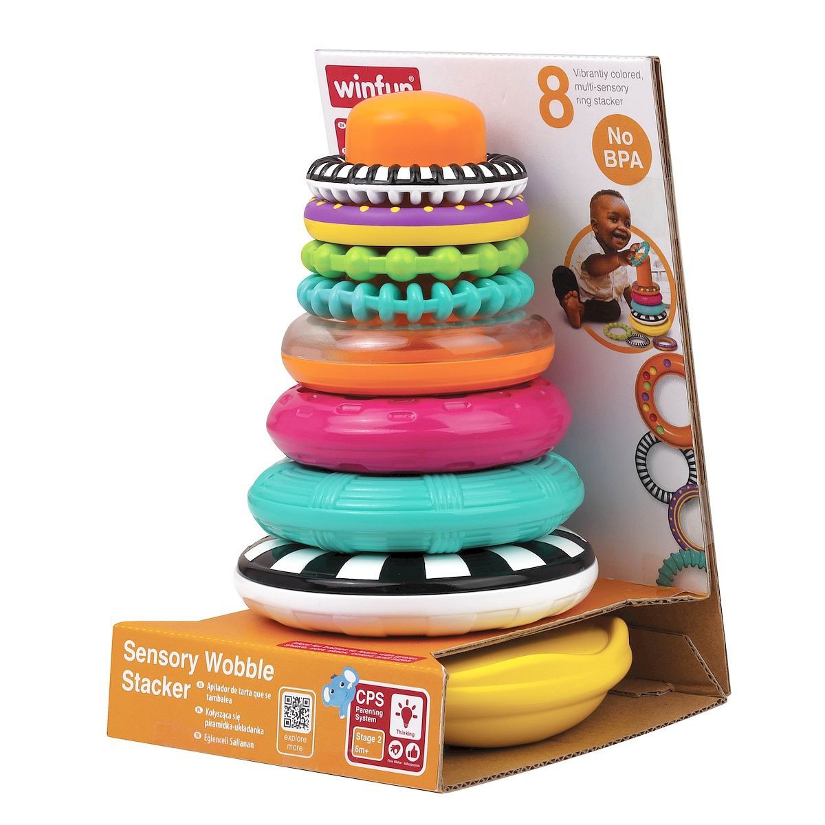 Zabawka składa się z 8 pierścieni o różnych kolorach, fakturach i wzorach, które dziecko może układać na podstawie o zaokrąglonym spodzie co sprawia, że całość się kołysze, dodając element zabawy i wyzwania.