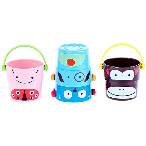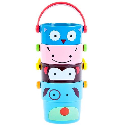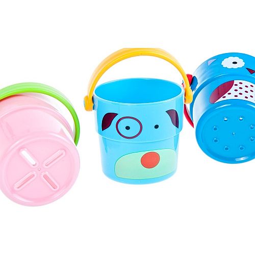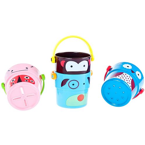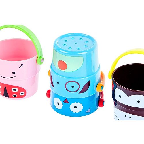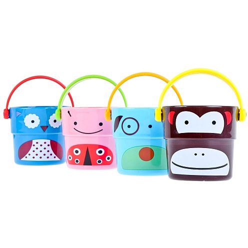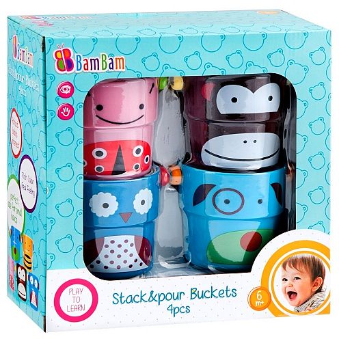 Zestaw 4 wiaderek do kąpieli marki Bam Bam dla dzieci od 6 m-ca życia. Idealna zabawka do kąpieli jak i zabawy na plaży czy w piaskownicy. Każde z wiaderek posiada rączkę oraz dziurki w dnie przez które przelewa się woda, a wyprofilowany kształt pozwala wkładać jedno w drugie. Na ściankach wiaderek znajdują się postacie małpki, psa, biedronki i ptaszka. Zabawka doskonale pobudza wyobraźnię oraz uczy zasad logicznego myslenia.