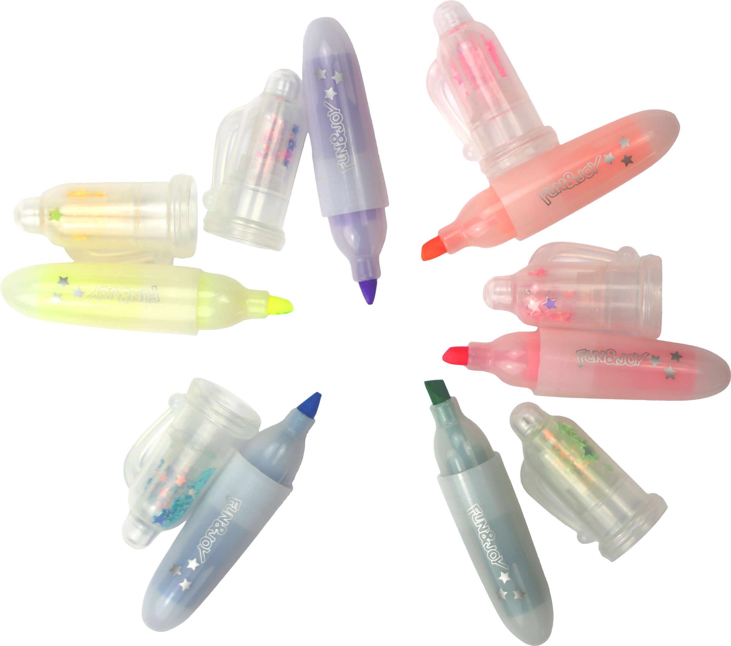 Dostępne: 4563 Sztuk Lub zamów telefoniczne: 690 216 578Zestaw 6 zakreślaczy w rozmiarze mini. Okrągła obudowa zamykana przezroczystą skuwką wypełnioną błyszczącymi gwiazdkami w kolorze tuszu. Grubość linii pisania 1-4 mm. Pakowane w praktyczny woreczek na suwak.