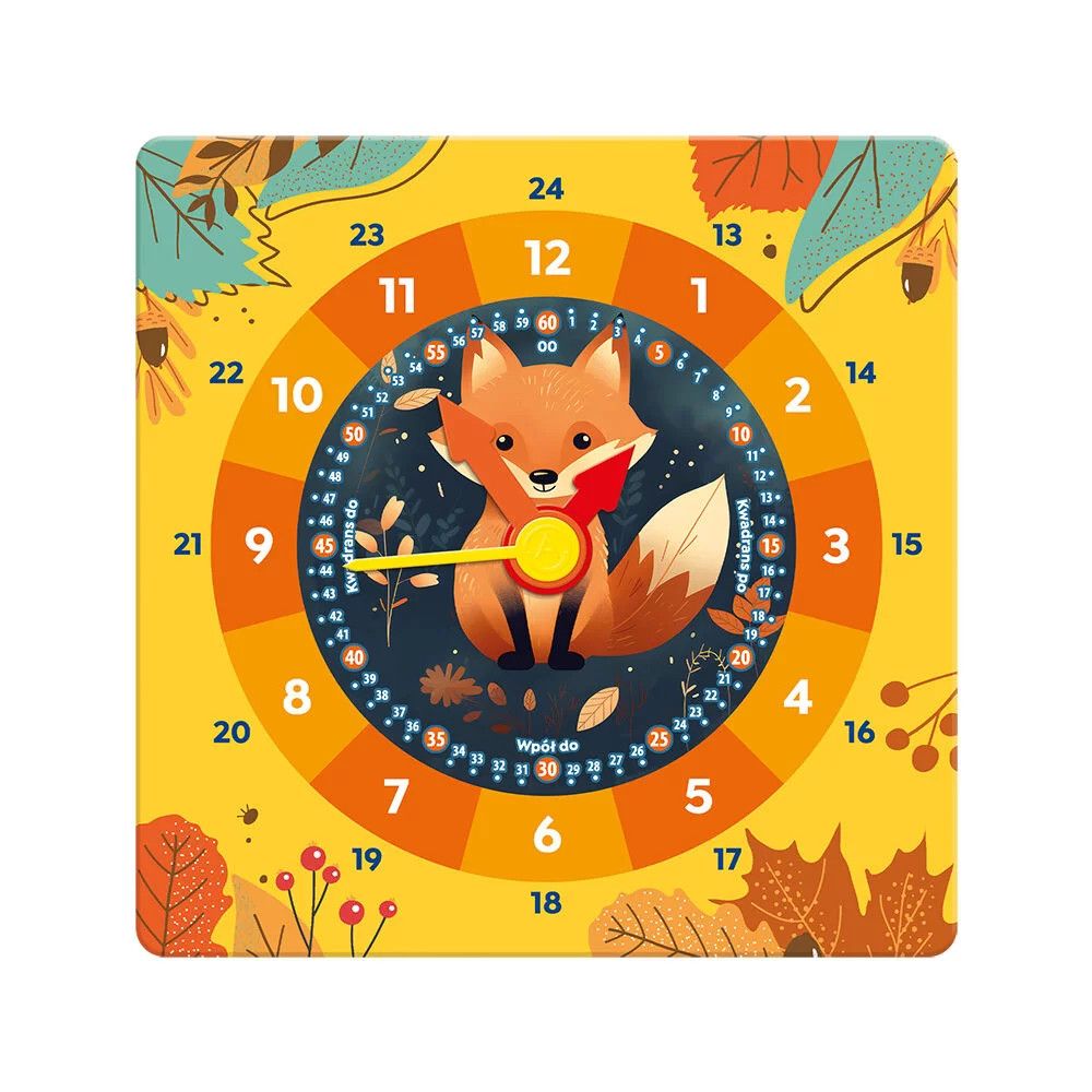 Dostępne: 4 Sztuk Lub zamów telefoniczne: 690 216 578Pięknie zilustrowana zabawka edukacyjna w formie zegara. Tarcza zegara umieszczona jest na solidnej tekturze o rozmiarze 23 x 23 cm. Ruchome wskazówki z tworzywa, pozwalają na samodzielne ustawianie zarówno godzin, minut jak i sekund. Na tarczy znajdziemy oznaczenia pozwalające na wskazania w systemie 12 – sto jak i 24 – ro godzinnym. Dla łatwiejszej nauki wprowadzono oznaczenia „kwadrans do”, „wpół do”, jak i „00”. Zabawka pozwala w przyjemny i praktyczny sposób opanować znajomość zegara w towarzystwie sympatycznego liska z ilustracji.