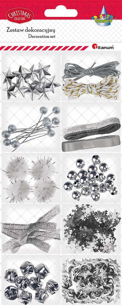 Dostępne: 1243 Sztuk Lub zamów telefoniczne: 690 216 578Zestaw dekoracji 12 rodzajów, kolor srebrny: koraliki, dzwoneczki, gwiazdki 3D, pompony poliestrowe, kuleczki na druciku, kokardki brokatowe ze wstążki z lureksem, wstążka brokatowa z lureksem, sznurek jutowy, sznurek pleciony, sznurek bawełniany skręcany, konfetti płatki śniegu, cekiny gwiazdki.