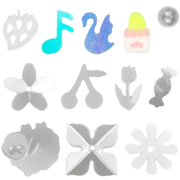 Dostępne: 1278 Sztuk Lub zamów telefoniczne: 690 216 578Zestaw: perełki - średnica 4 mm, cekiny - kwiatek płaski średnica 10 mm, kwiatki wypukłe 2 wzory 10 mm, konfetti truskawka 5x7 mm, czereśnie 10x9 mm, nuta 6x9 mm, łabędź 6x8 mm, cukierek 8x3 mm, owca 12x11 mm, lód na patyku dwustronny 4x7 mm, tonacja biała. 14 g.