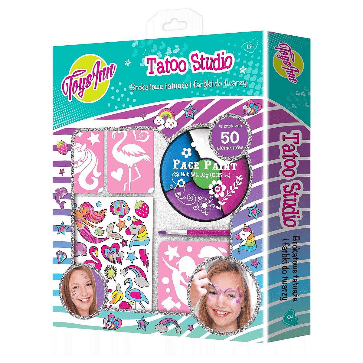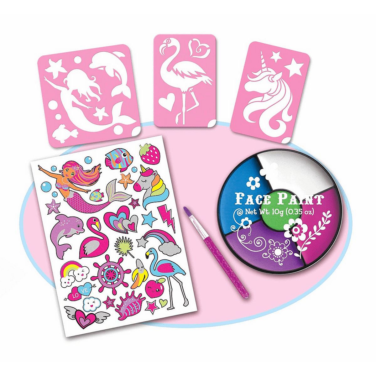 Farbki do twarzy w 5 kolorach (biały, niebieski, różowy, fioletowy i zielony), 3 szablony, 45 brokatowych tatuaży, 1 pędzelek. Zestaw przeznaczony dla dzieci powyżej 6 roku życia.