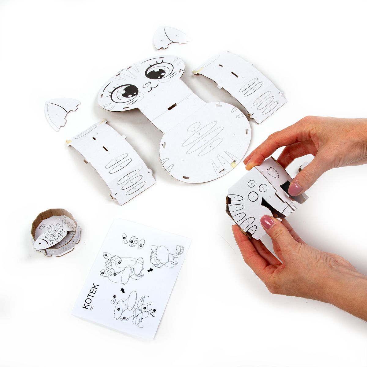 INSTRUKCJE: Wypchnij kształt figurki z szablonu. W miejsce kółek przyklej taśmę dwustronną. Złóż figurkę zaginając ją w wyznaczonych miejscach i sklej. Przy pomocy naklejek dopełnij figurkę brakującymi elementami i dodaj ozdoby.