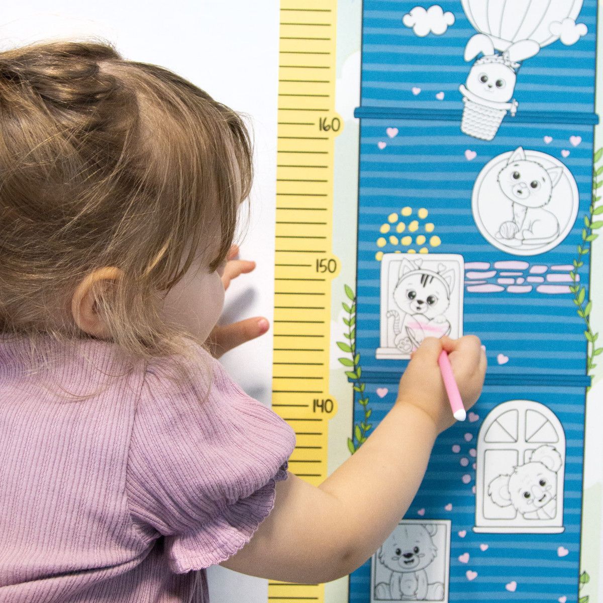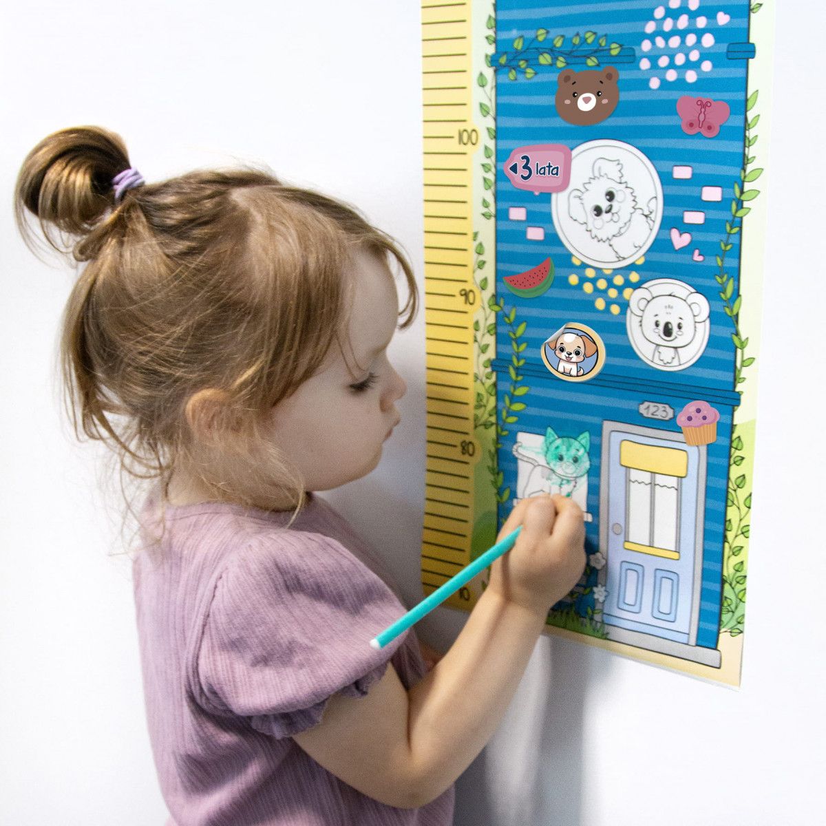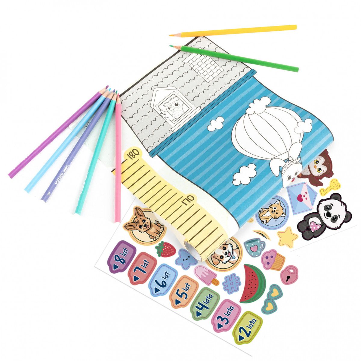 Kreatywna miarka wzrostu. Pozwala dziecku na obserwowanie swojego rozwoju i wyrażanie siebie poprzez sztukę. Dzięki miarce nie trzeba już zaznaczać wzrostu dziecka na drzwiach. Zawiera nadrukowane wzory, które można pokolorować według własnego pomysłu. W zestawie znajdują się kredki, tematyczne naklejki oraz miarka wykonana z samoprzylepnego papieru, który można z łatwością przykleić do ściany i łatwo usunąć nie zostawiając śladów. To idealny prezent dla każdego, kto lubi się uczyć i jednocześnie tworzyć coś kreatywnego. Może stać się niezwykłą ozdobą każdego pokoju dziecięcego.